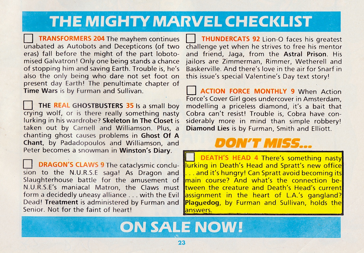 With the same issues of Action Force Monthly and Thundercats as last time and brand new editions of Death’s Head and Dragon’s Claws, it’s the exact opposite of our previous checklist. Death’s Head gets the prime real estate and deserves it but for a reason not mentioned here; it’s one of the funniest issues of the run right from the off. You can check out some of its hilarious highlights via the link at the bottom of this post.