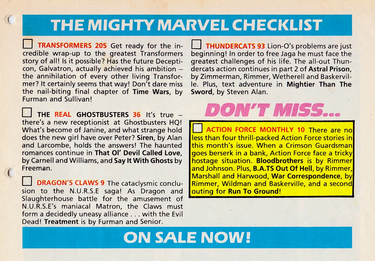 As you can see, three of the six comics on this week’s checklist have featured before and the only new one besides the two in my collection is Thundercats which contained… a Valentine’s Day story? Okay then. Advert-wise, a teaser for a new Marvel UK monthly took up a full page in The Real Ghostbusters this week, and although there wasn’t enough room in Transformers the two brothers Sleeze still managed to squeeze themselves in.