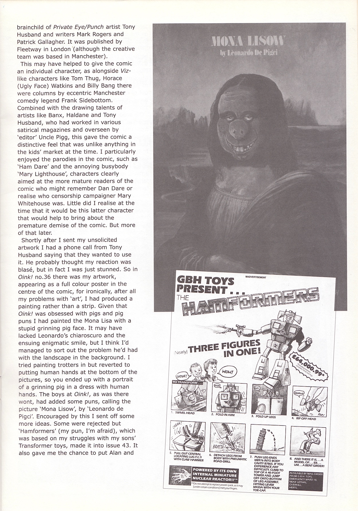 Interestingly, Dave wasn’t hired by the team to create his first piece, the Mona Lisow (the name given to it by the editors), instead he sent it in unsolicited and they saw in him a potential part of the team. He returned in #43, my favourite regular issue and the second Christmas edition with The Hamformers and there’s a funny story included here about his kids appearing on that one.