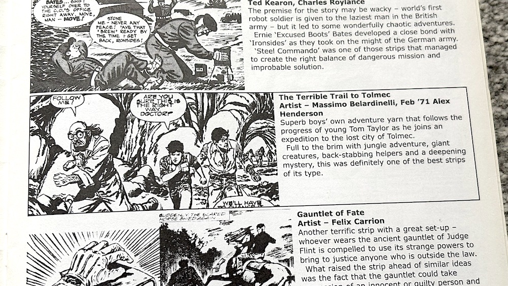 In a quick look at the short-lived Thunder we have brief mentions of Dusty Binns and The Terrible Trail to Tolmec, drawn by Ring Raiders’Geoff Campion (also misspelled) and Wildcat’sMassimo Belardinelli respectively, and both artists also contributed to licenced anthology horror comic Super Naturals at different stages.