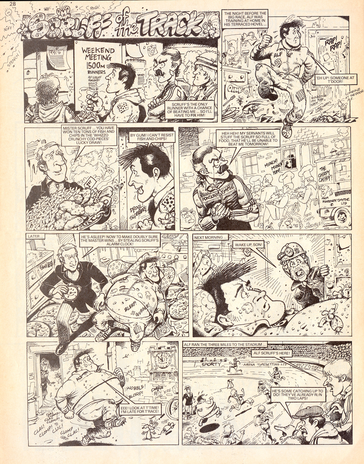 He first appeared in the pages of #11 with Scruff of the Track, written by OiNK co-creator/co-editor Mark Rodgers who is also sadly no longer with us. On the surface it’s drawn in a style that wouldn’t have looked out of place in action adventure comics of the day, at least until you start reading it that is. Upon closer inspection it’s so jam-packed with background detail and visual gags that it pays to take your time and relish every single panel.