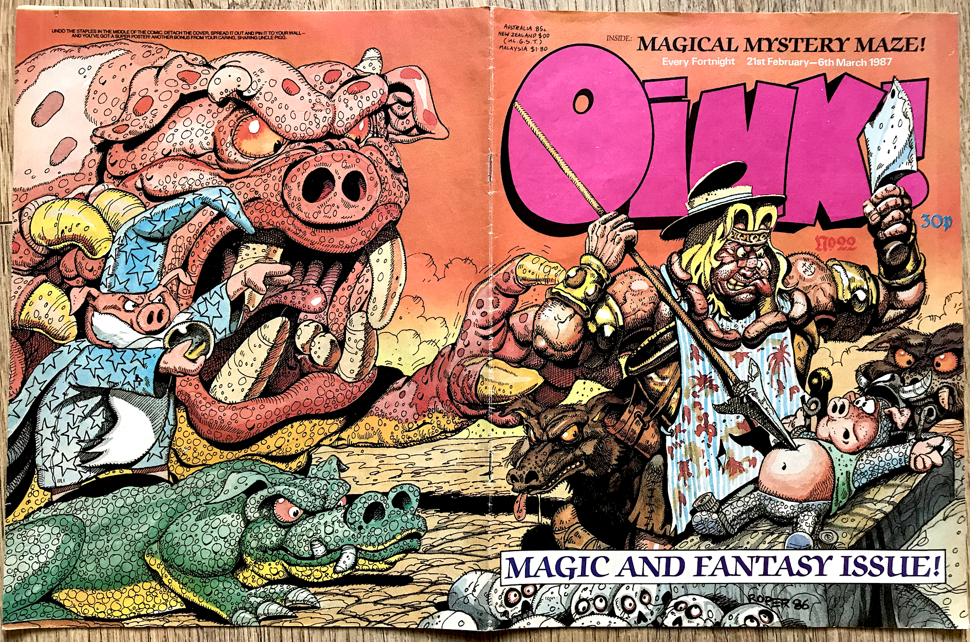 Prince Endor and his amazing eyewear returned two more times, for a much longer story in the regular comic and then in the second (and final) annual, The Oink! Book 1989. While Scruff of the Track was gorgeous to look at in its own right, when Andy applied colour the result was nothing short of amazing. Just take a look at this double page spread from the aforementioned annual to see what I mean.