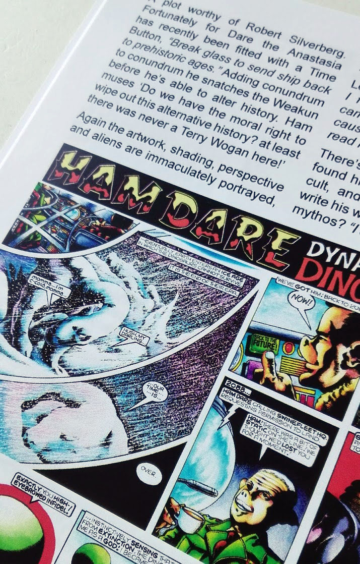 On his own blog, Lew states, “The interview is part of a six page feature called The Fake Dan Dare Syndrome by Andrew Darlington which also includes other Dan Dare spoofs and related strips such as Danny Dare from Wham!. The article mentions that my Ham Dare plot bears a passing resemblance to the 1957 novel Wolfbane by Frederik Pohl…. which came as a surprise to me because I’d never even heard of that book until now!”