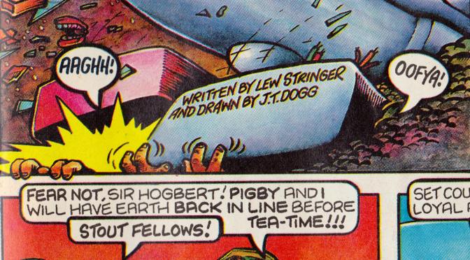 Lew discusses his working relationship with Malcolm, how they only met once at the OiNK launch party and communicated mainly by phone. Full scripts were sent to Malcolm and it was co-editor Mark Rodgers‘ idea to have him as the artist, lending a more direct homage to Dan Dare to the strip than the cartoonish art Lew had envisioned. He also talks about that dinosaur extinction scene and the emotions he felt writing it, which many pig pals felt when reading the surprisingly touching moment.