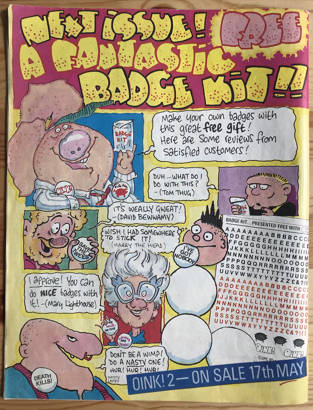 Tomorrow sees the 35th anniversary of OiNK‘s sophomore release and just like the previous issue’s promo in the preview comic, the advert for #2 (on the back cover of #1) concentrated on the free gift. This time it would be a selection of stickers to make your own badges. The front cover of the next issue would provide some of the funniest examples, but if you can’t remember them you’ll just have to wait for the review.