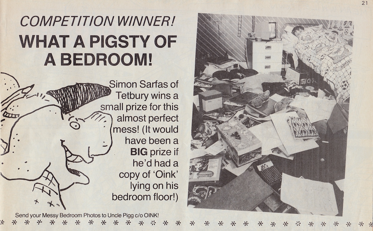 In the early days of the comic our esteemed editor ran a regular competition in which he’d judge readers’ messy bedrooms. It was a case of the messier the better and those chosen to feature would win a piggy prize. This time around pig pal Simon Sarfas showed us how it was done and the result was probably not a million miles away from my own childhood bedroom, although these days it makes me cringe thinking about a mess like this! I’m just showing my age now.
