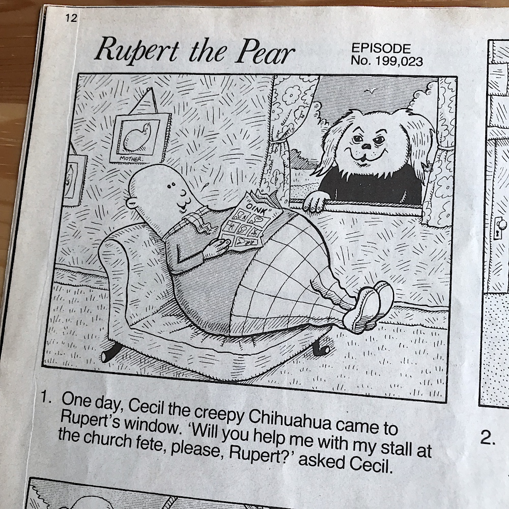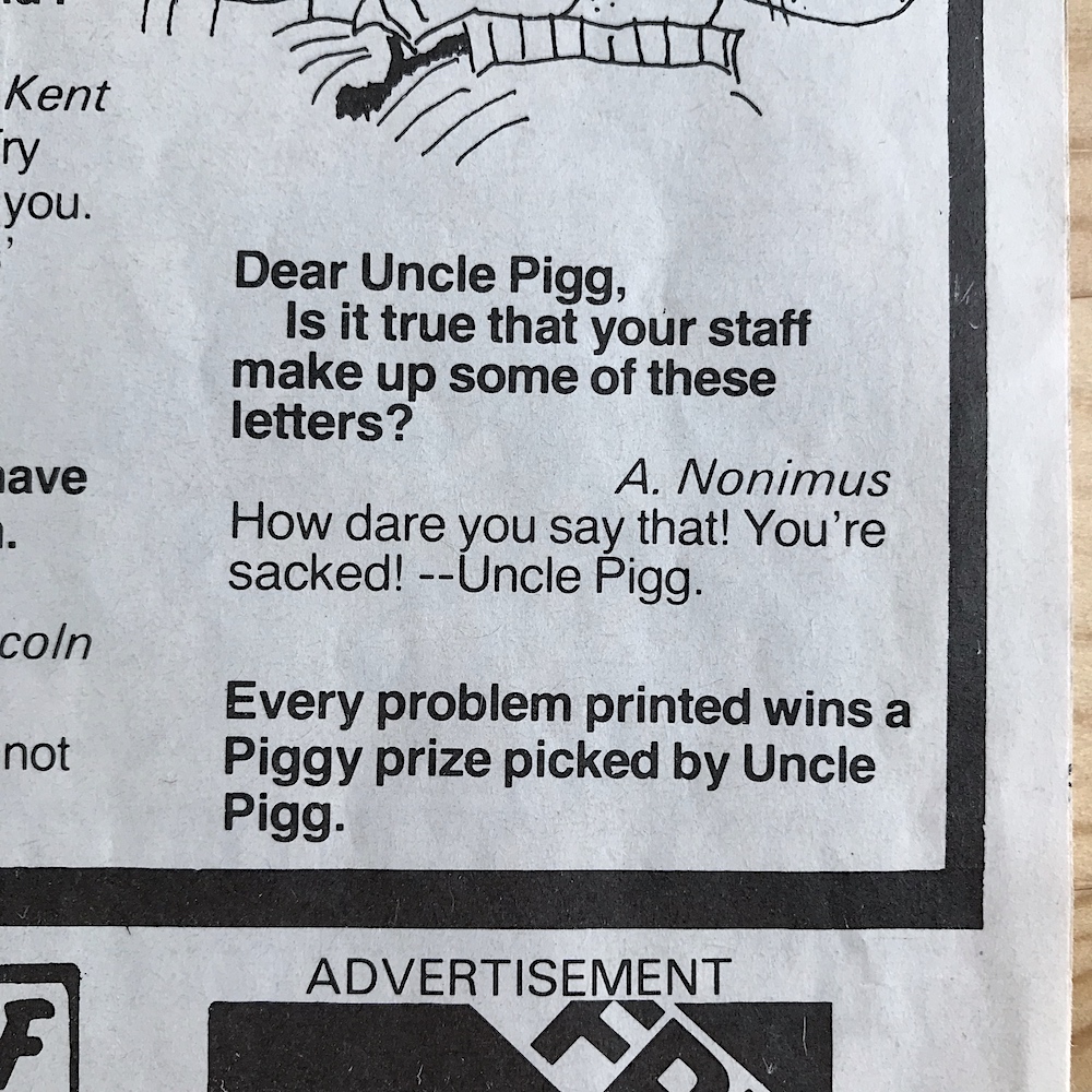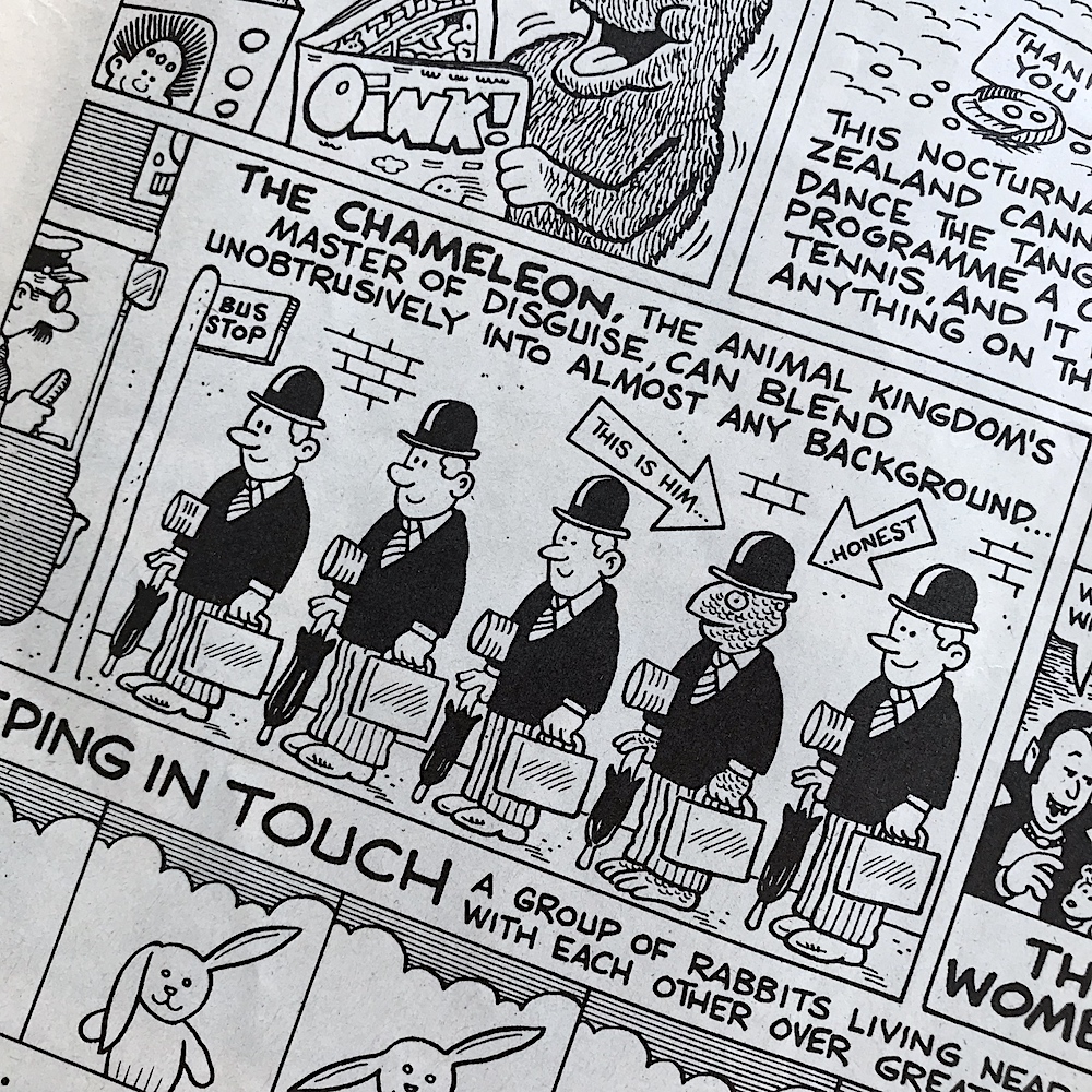 If you track this issue down on eBay (and you really should) you’ll find Jim Needle‘s Pete’s Pup continuing to terrorise his family with his monstrous appetite, there’s another spoof of a children’s favourite in the shape of Rupert the Pear, the Grunts page admits it had to get creative in the early issues and Uncle Pigg’s Amazing Facts About Animals showed OiNK could be an educational read.