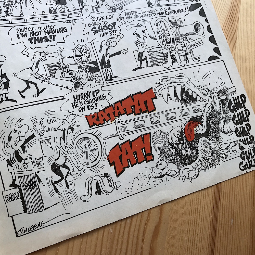 You should prepare yourself for this final highlight, especially if you groaned at the conclusion to Watery Down. While that had two pages to build up to one gag, Fish Theatre starring Noel Pilchard does the opposite and squeezes in an absurd amount of puns into its one page. Written by Graham Exton and drawn by Ed McHenry, Graham told me how he’d often use up several scripts worth of puns all at once, robbing himself of the chance to use his vast array of jokes over many stories.