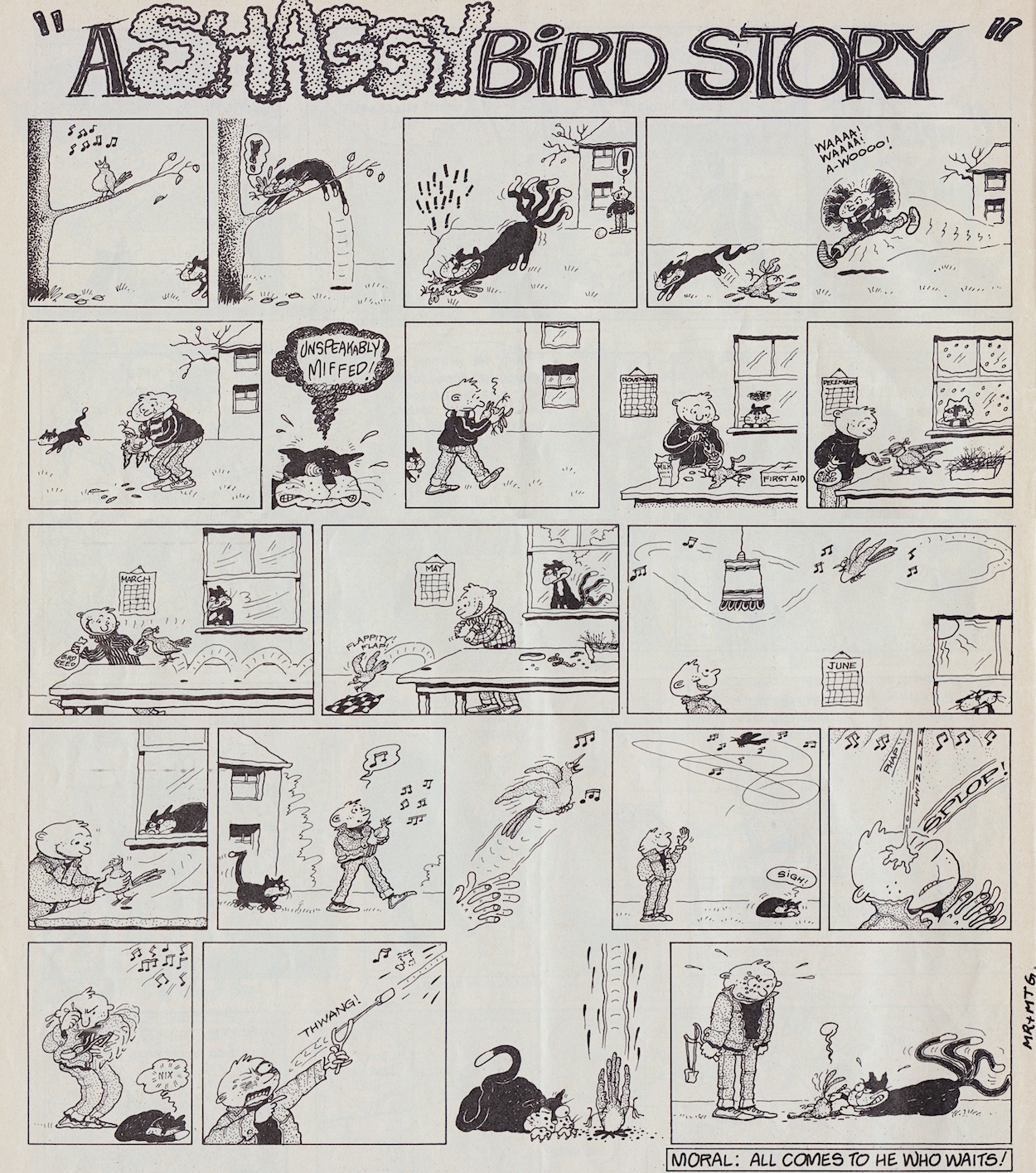 Another one-off I wanted to include is written by Mark Rodgers and drawn by Weedy Willy‘s artist, Mike Green. A Shaggy Bird Story is the sweet tale of an injured animal being taken in and looked after by a young boy, who nurses it back to health before releasing it back into the wild. It all starts off innocently enough with the boy’s “unspeakably miffed” pet cat setting things in motion.