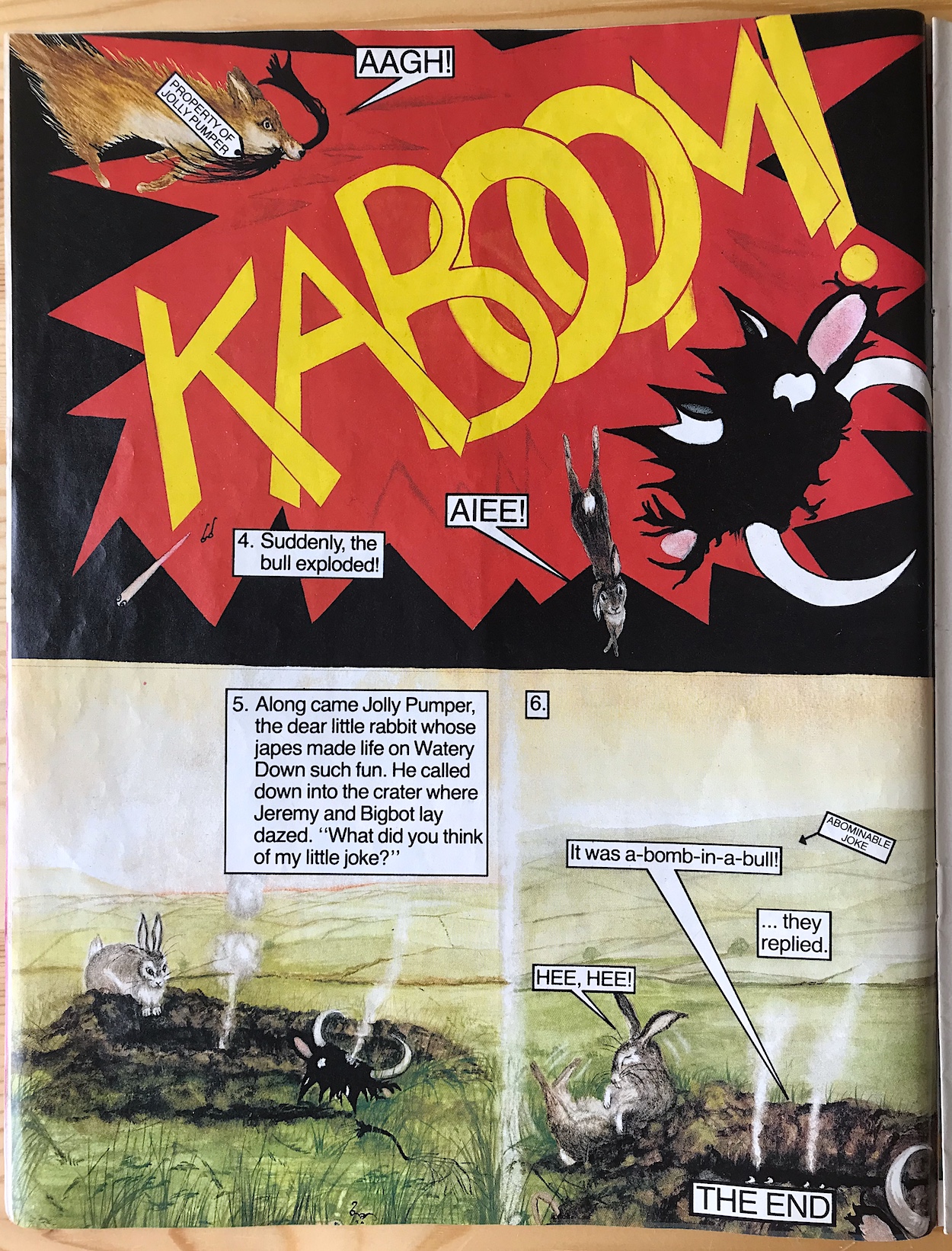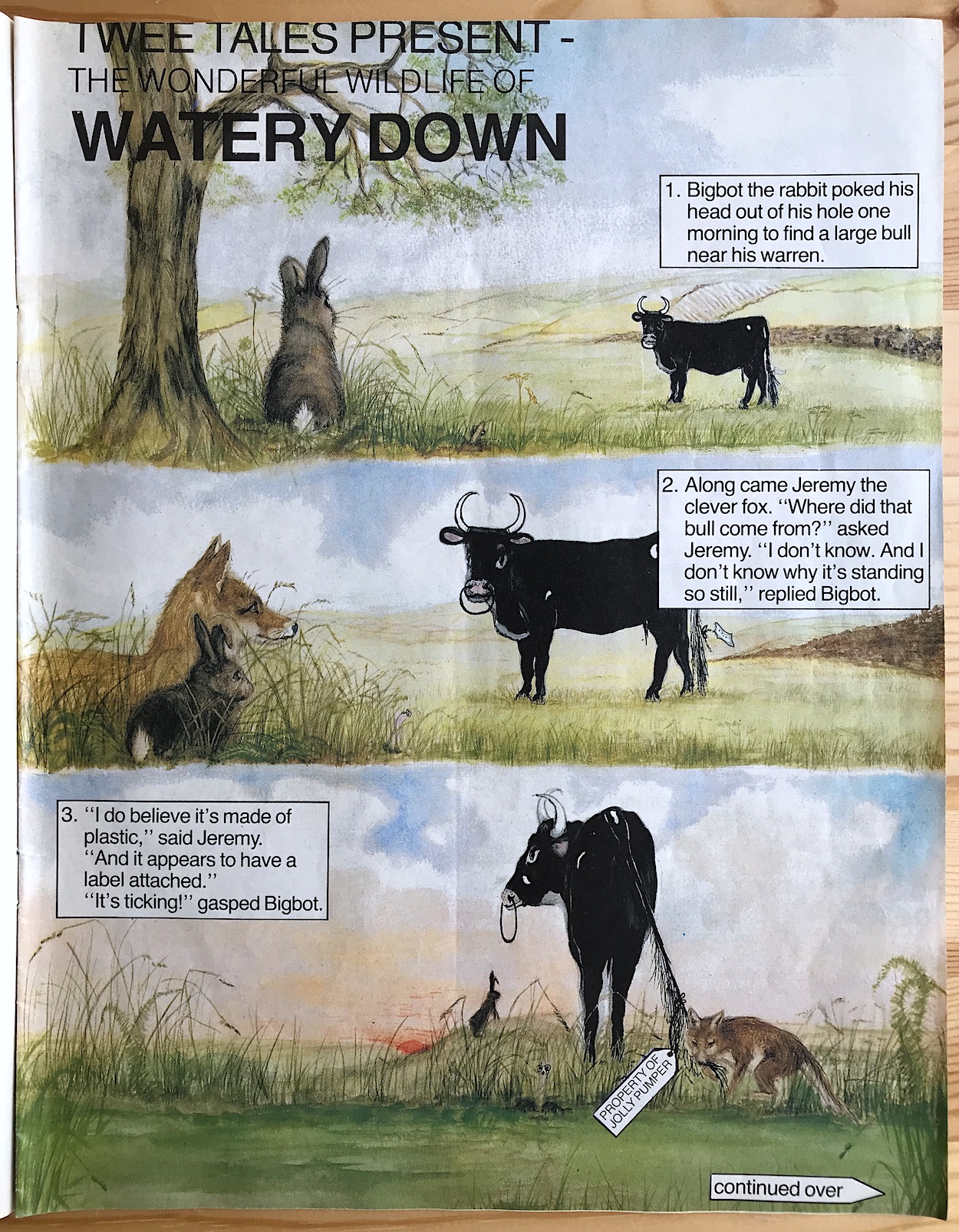 Co-editor Patrick Gallagher‘s neighbour, Ann Martin brought her gorgeous artwork to a spoof of Richard Adam‘s classic novel Watership Down. The script is one big set up for a good old pun so marrying it with such beautiful illustrations, which wouldn’t look out of place in a children’s book, is a wonderful move. The first page puts the reader at ease with its gentle fields and cute critters before we turn over to the second half.