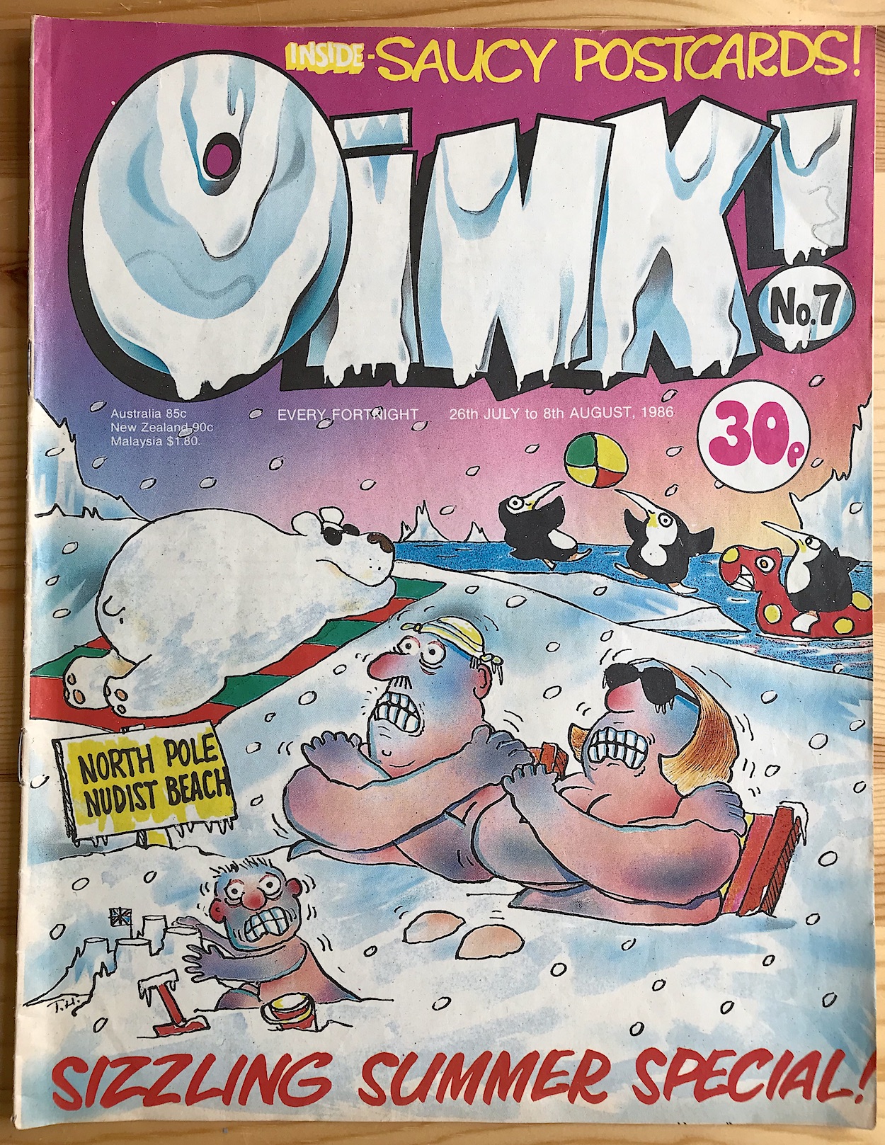 OiNK was aimed at children, not their parents, and the kids found it hilarious. However, while only two people complained, W.H. Smith still placed OiNK on their top shelves as a result. A ridiculous situation. But a year later in an interview co-editors Mark, Patrick and Tony Husband would be all too happy to confirm sales of 100,000 per issue so never underestimate pig power. Tony also recently told me IPC loved the attention things like this brought.