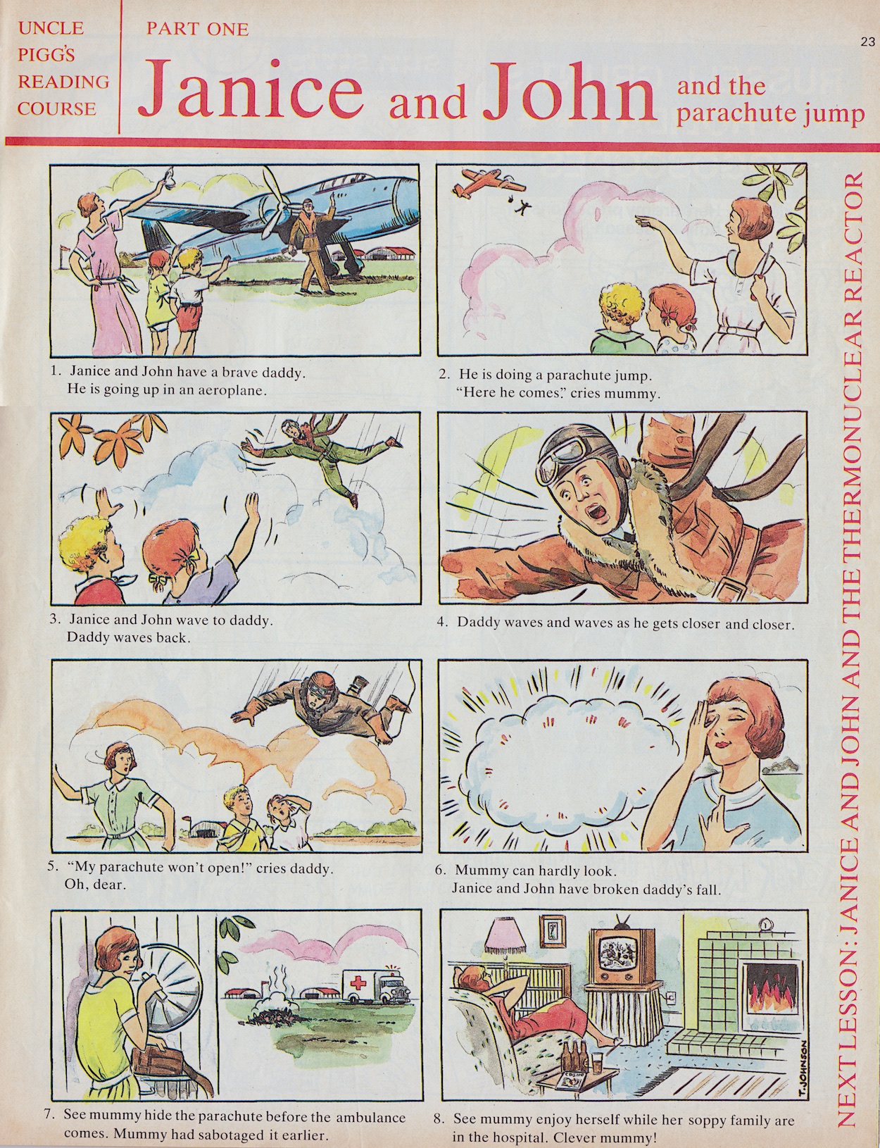 Well first, here’s the story itself which co-editor Patrick Gallagher believes was written by Mark Rodgers. Every pig pal remembers Janice and John and the Parachute Jump, which was illustrated by Trevor Johnson, a friend of Patrick’s and a renowned Manchester graphic designer who did a lot of work for Factory Records and the famous The Hacienda.