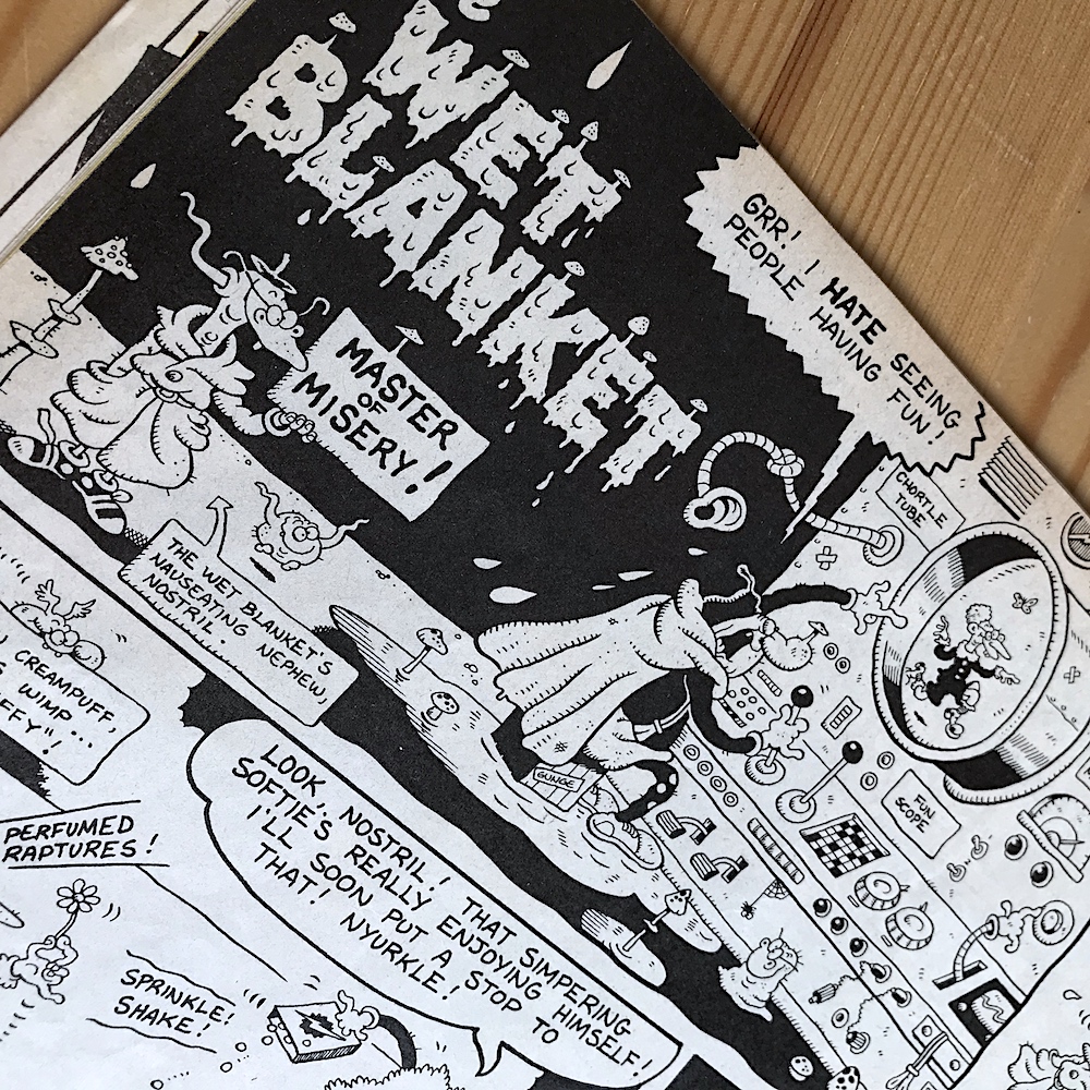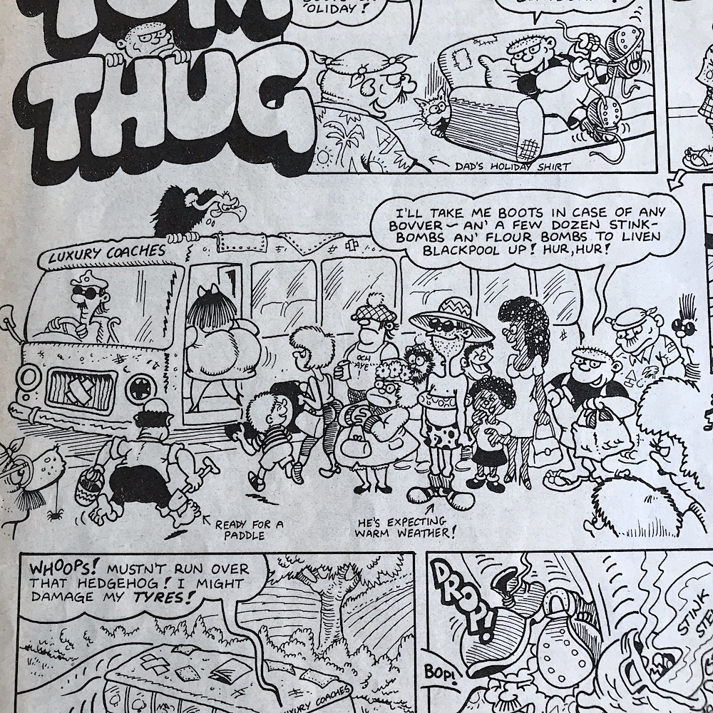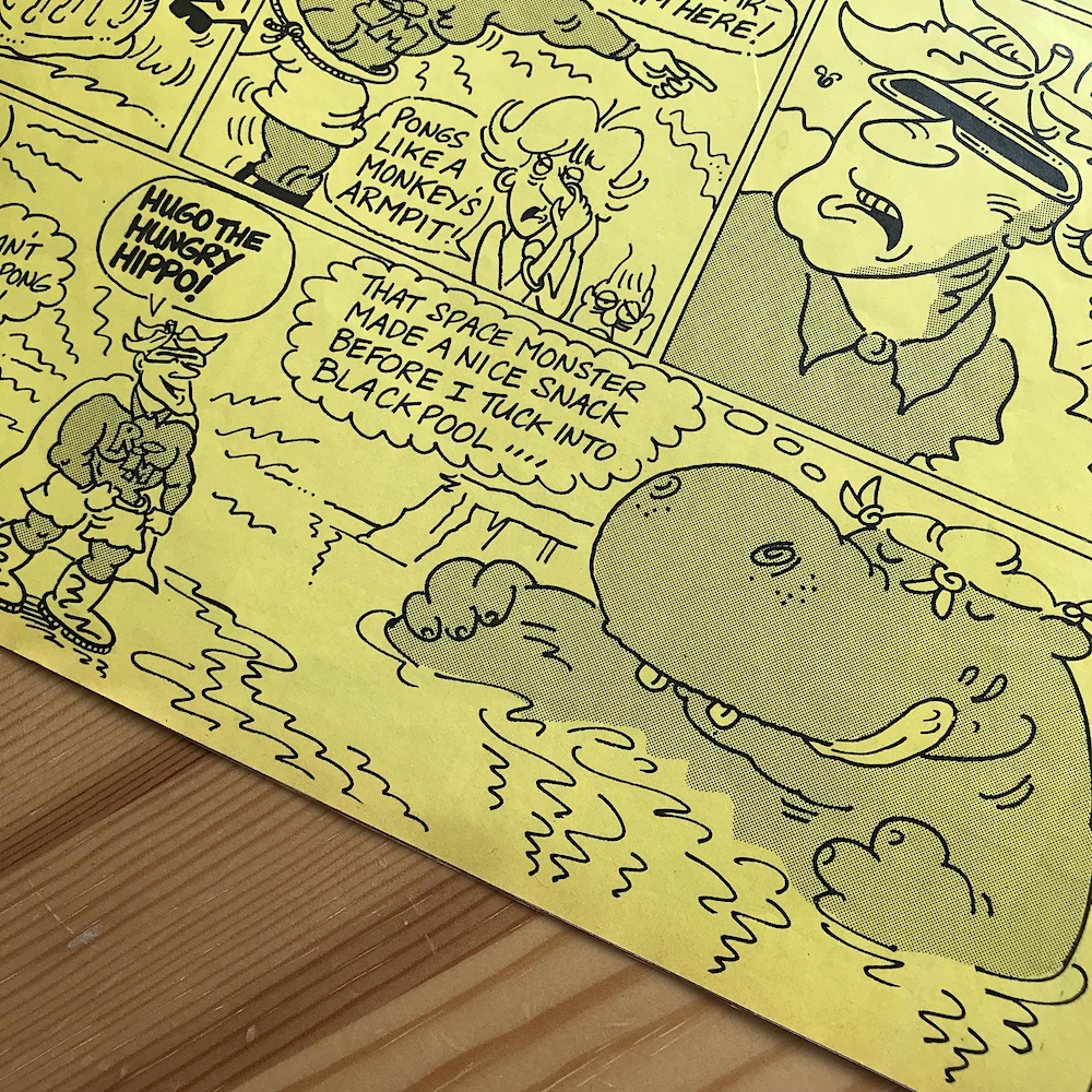 Let’s have a quick look at some other highlights from this summery edition, starting with an early character called New Wave Dave who was a bit too keen to be part of that 80s scene. Dave was drawn by Viz founder Chris Donald. Tom Thug went on an ‘oliday to Blackpool with a regular selection of British folk (we’ll see how he gets on next time). There was a comics crossover of gigantic hippopotamus proportions when Hugo the Hungry Hippo popped up to save the day in Rubbish Man, Tom Paterson‘s hilarious Wet Blanket will see publication again later this year and roles were reversed in Horace (Ugly Face) Watkins.