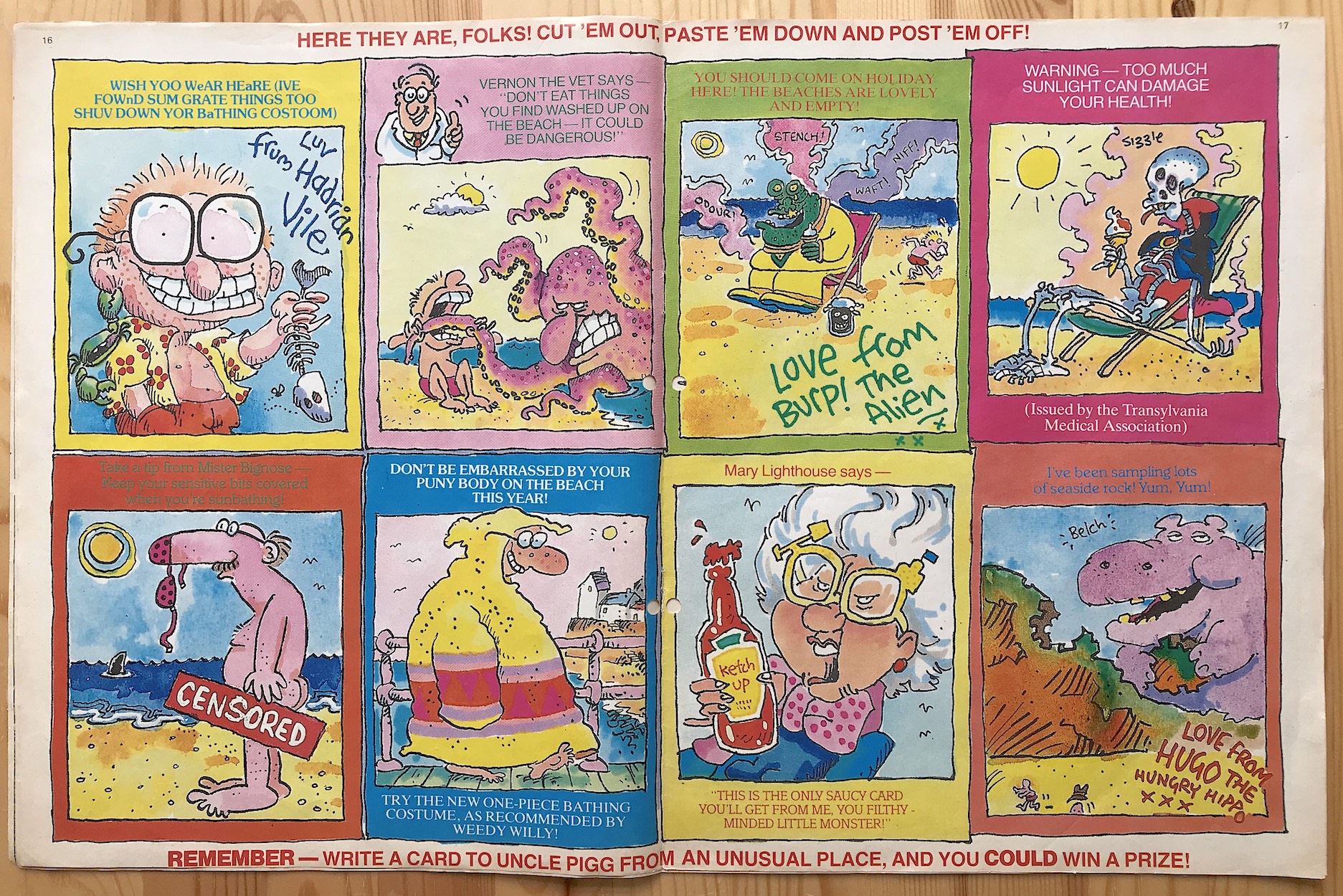 Some time next year you’ll see the actual postcards the comic gave away with a few issues. I’ve a foggy memory of wanting to take them on holiday but not sure if I ever did, and they were separate from the comic. So I doubt I would’ve cut up my OiNK to use any of these if I’d been collecting the comic at this point. Why would you want to send away these pieces of art?