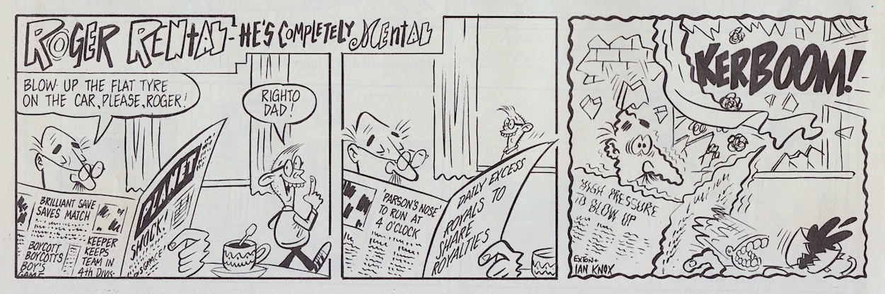 What else can be said about this strip? Nothing really. Simple, straight to the point and laugh out loud funny, that’s Roger Rental, He’s Completely Mental, written by Graham Exton and drawn by his regular artist Ian Knox. To this day I can remember reading certain entries in his series of tiny, one-joke strips as a kid and just losing it with the sheer, unintended anarchy of it all.
