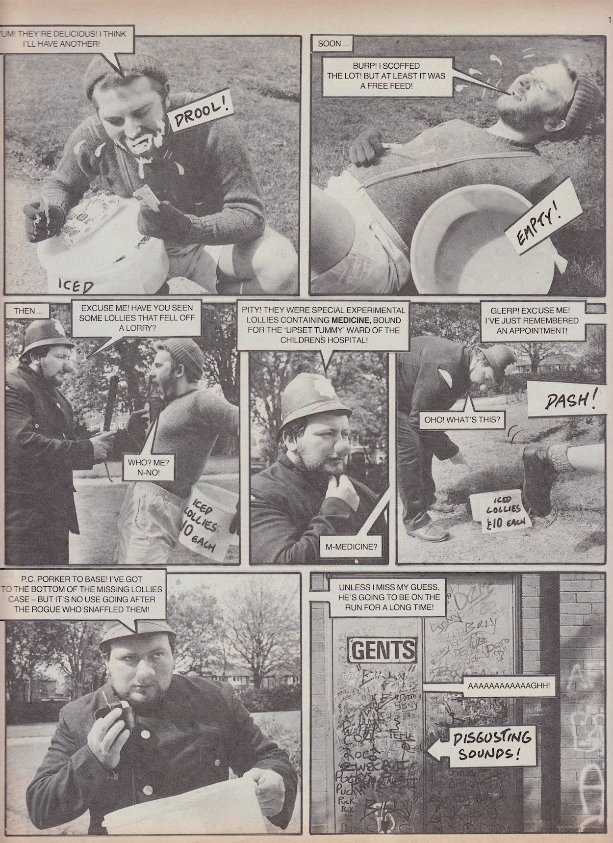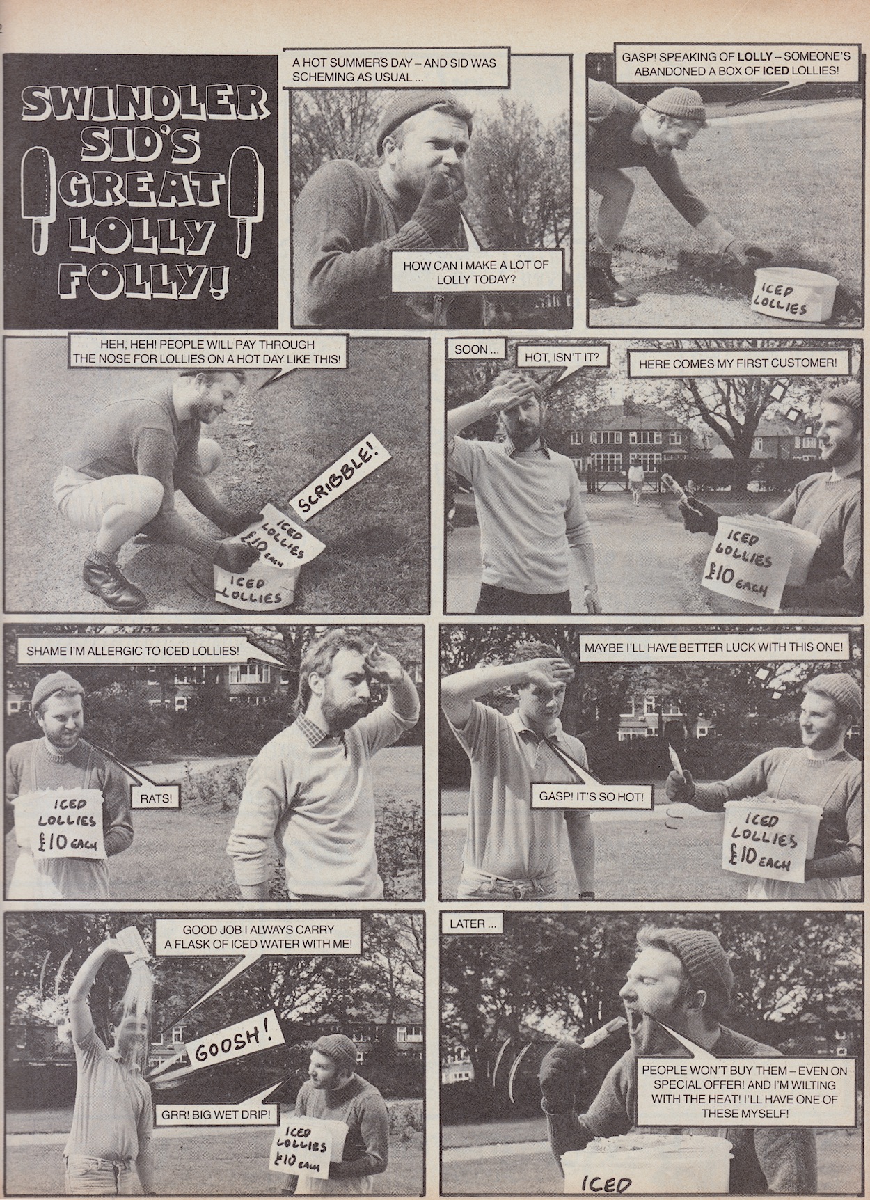 At the beginning of OiNK’s run there was a competitor to Snatcher Sam‘s crown as the most idiotic thief to appear in a photo story. His name was Swindler Sid. Played by a good friend of Patrick’s called Nick Bell, the strips were photographed by Patrick’s brother James who we saw as a Typical OiNK Reader back in #5. Despite the consequences of Sid’s actions here I think we’d all risk it at the moment given the weather outside.