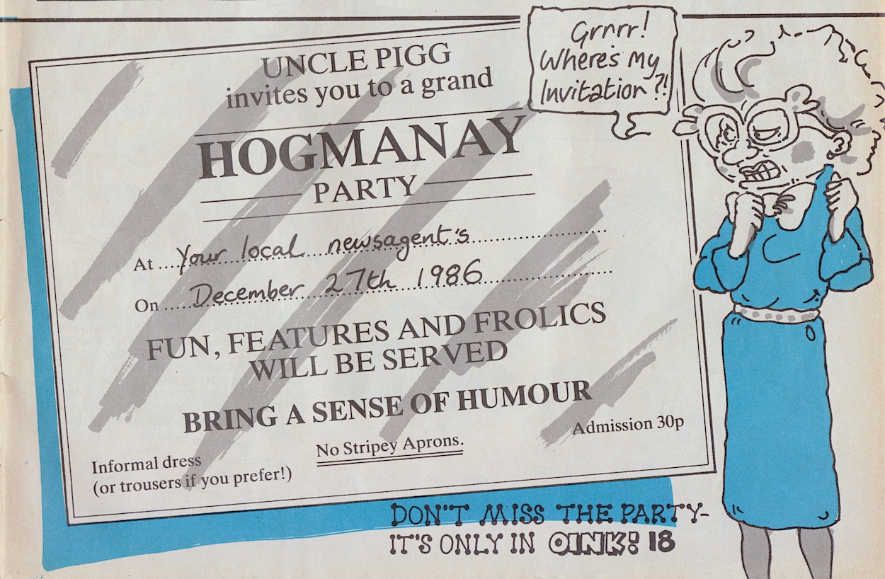 As a child I thought the theme of the next issue of OiNK was another pig-related pun, what with it being the HOGmanay special. I’d never heard of the word before and was initially a little disappointed to find out it wasn’t a pun at all. But then I realised with a name like that this Scottish celebration was the perfect way for Uncle Pigg and all of the crazy characters to see in the New Year. At the end of the Christmas issue we all got a special invite. All except one.