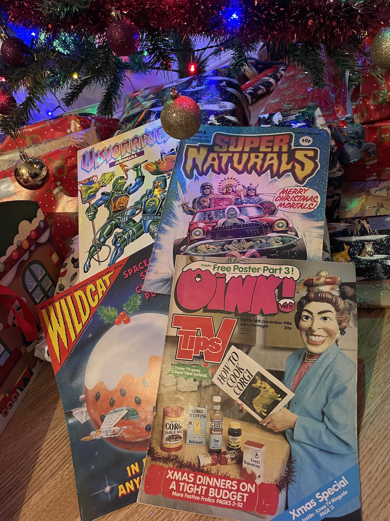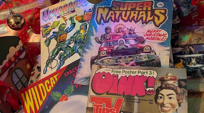 Regular readers will have already read the reviews and enjoyed the highlights from the special festive editions of OiNK and Wildcat pictured above (you have, haven’t you?) and tomorrow on The Big Day Itself is the first and only Visionaries Annual, a book many fans don’t seem to have been aware of until now. Yes, it would’ve been released during August or September back in 1988, but let’s face it we all got ours on Christmas Day from Santa, didn’t we? So that’s when the review will be up, followed immediately on Boxing Day with some superb, chilling ghost stories to go with the chilly weather in #5 of Super Naturals. Not to be missed!