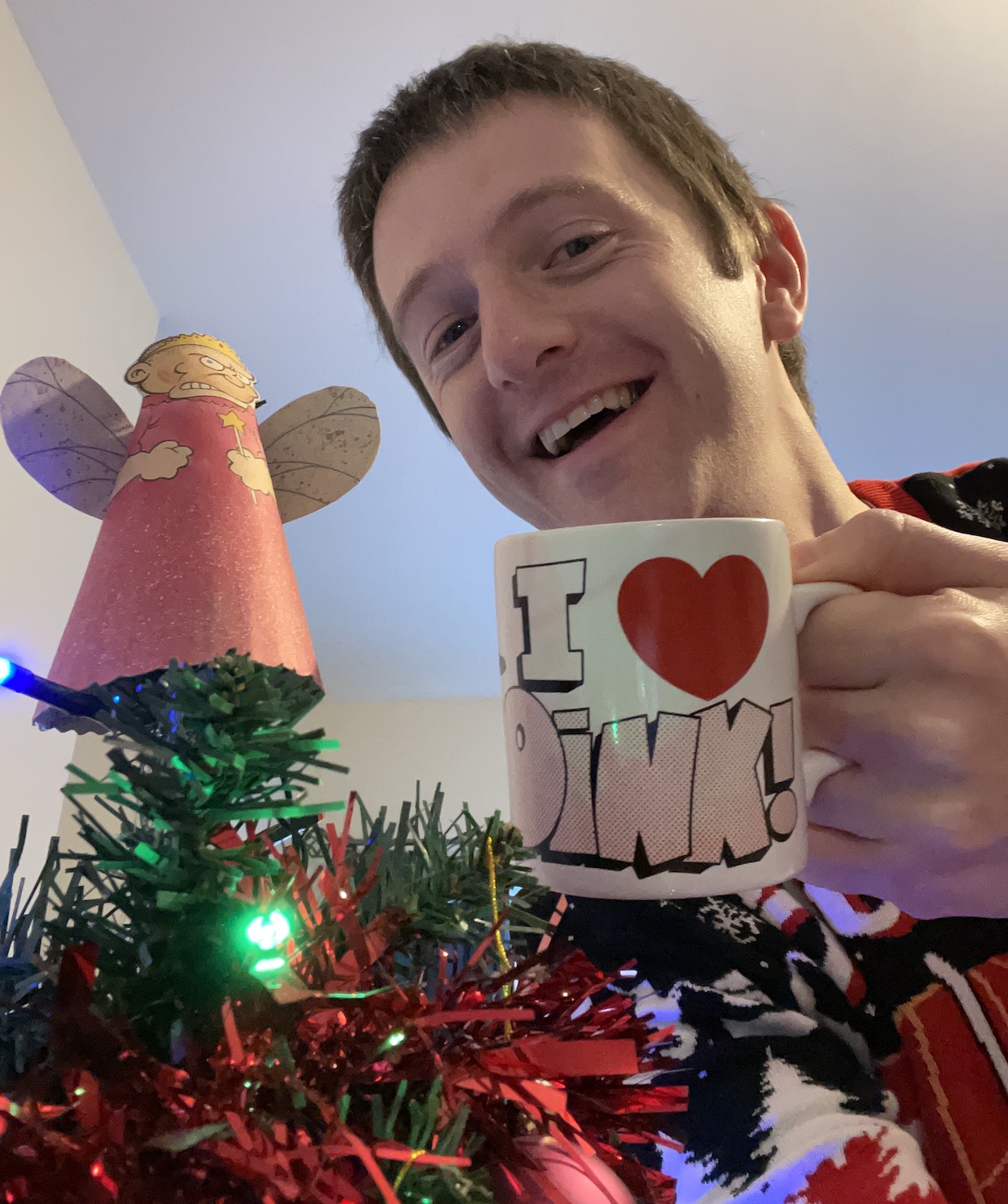 It really is the most wonderful time of the year and I think I become an even bigger kid with each passing festive season. Here I am a few weeks ago (complete with pandemic haircut, now sorted out) with my very traditional Christmas tree angel as drawn originally by Lew Stringer, having a seasonal coffee in that most elusive of OiNK merchandise, the mug(!) which was a Christmas present itself a few years back from Helen Jones. I’ve just popped on here this Christmas Eve to let you know about the content you’ll find on the blog over the next few days.