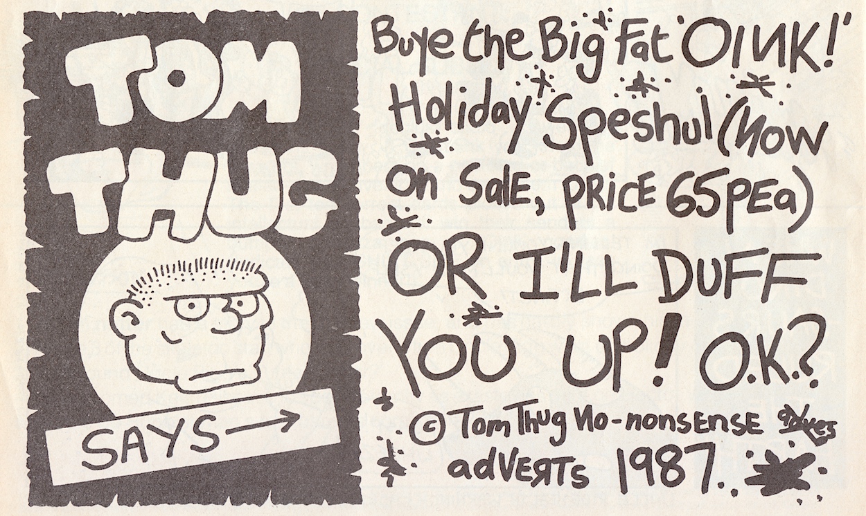 These promos for the Holiday Special are taken from issues #25 to #28. The first three were all put together by co-editor Patrick Gallagher (the Tom Thug panel taken from Lew Stringer‘s strip), the final one by Chris Sievey as Frank Sidebottom. The special was released on the same date as #25.