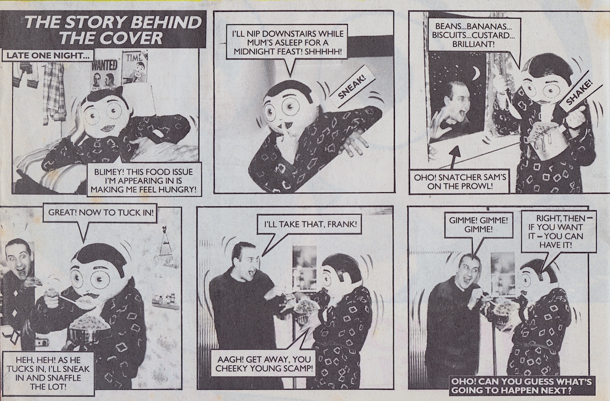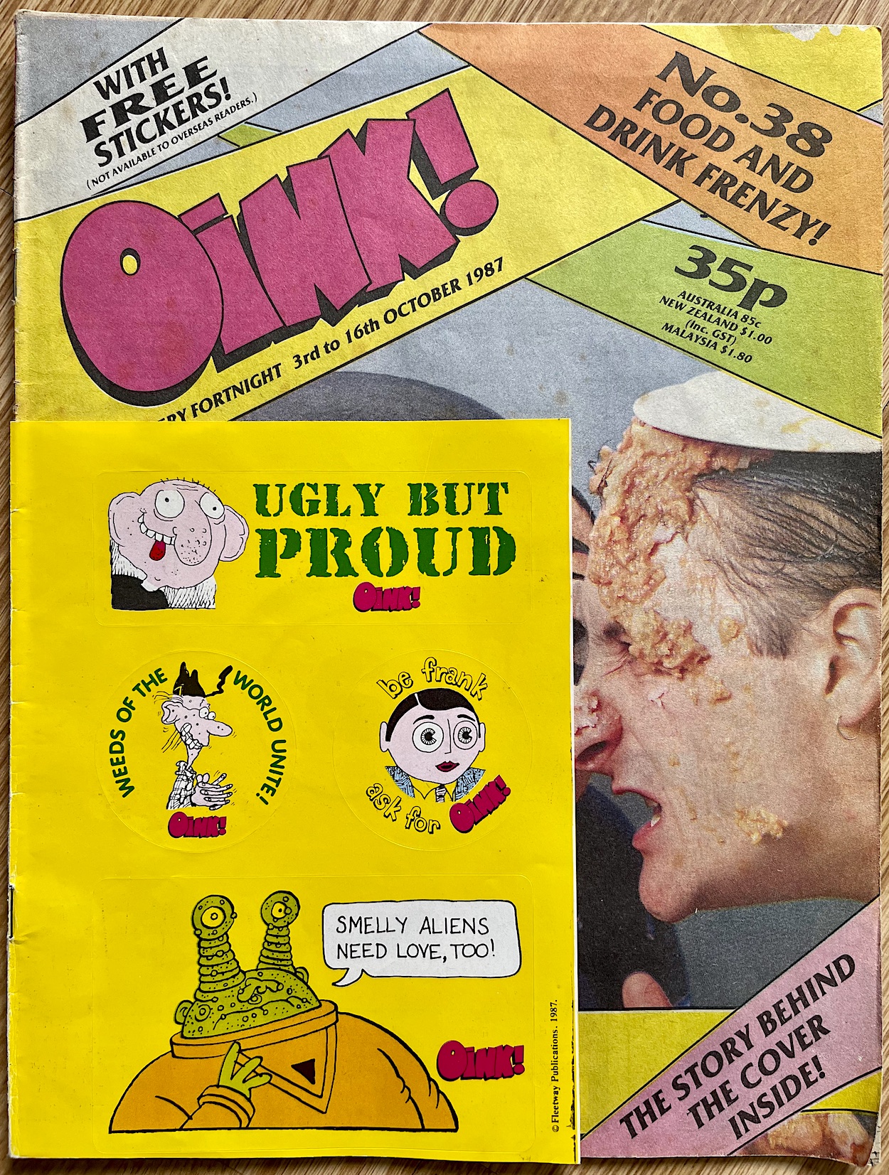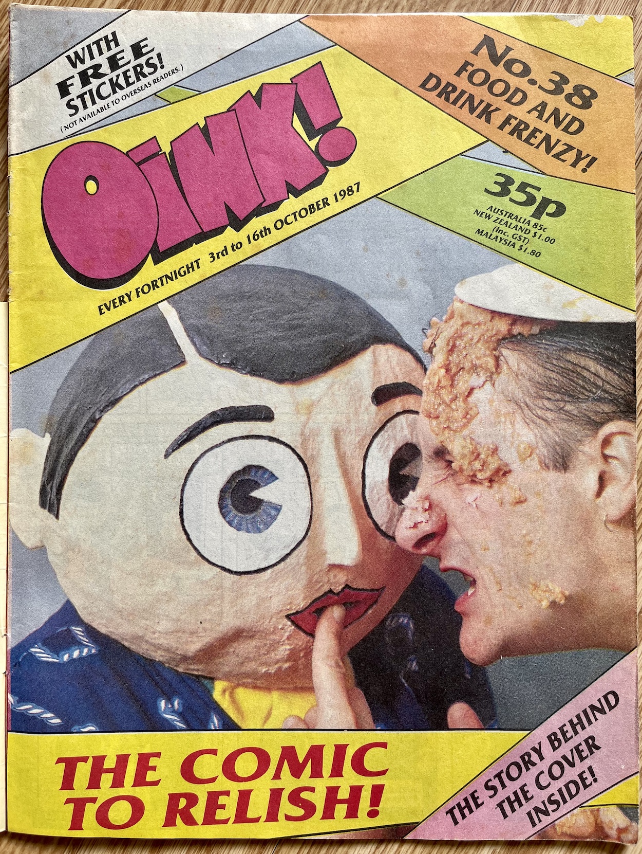 A cover that would surely stand out on the shelves, a full-page photograph of Frank Sidebottom (aka Chris Sievey) and Marc Riley as his alter ego Snatcher Sam getting into what appears to be a food fight, with a promise of a full story inside. Frank never seemed to be off our television screens at the time so having him in OiNK was always a major coup for the comic, having him on the cover even more so. Well, it would be if his face wasn’t covered with those wonderful stickers, of course.