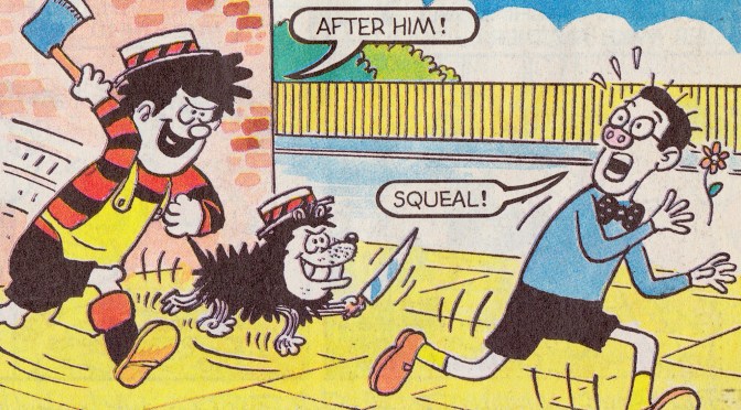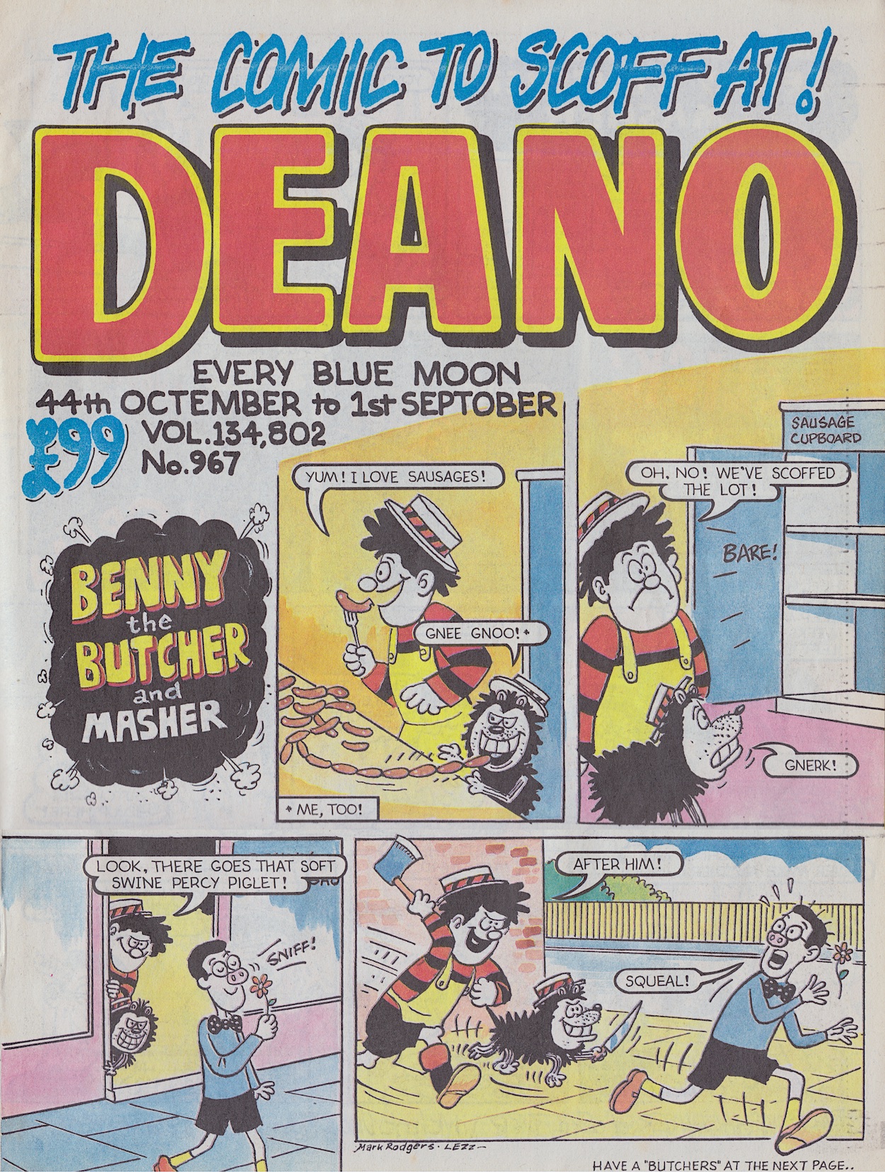 Brought to life by Les ‘Lezz’ Barton, the volume and issue numbers emphasise the running gag that the comics were tired and had been going on too long with the same humour, and it all goes rather dark on the second page. I’m not referring to the lights being turned off either. Let’s be clear, Dennis has just minced and eaten his pet dog! Then again, we are reading a comic which advertised burgers made of butchers in its preview issue, so the precedent was set.