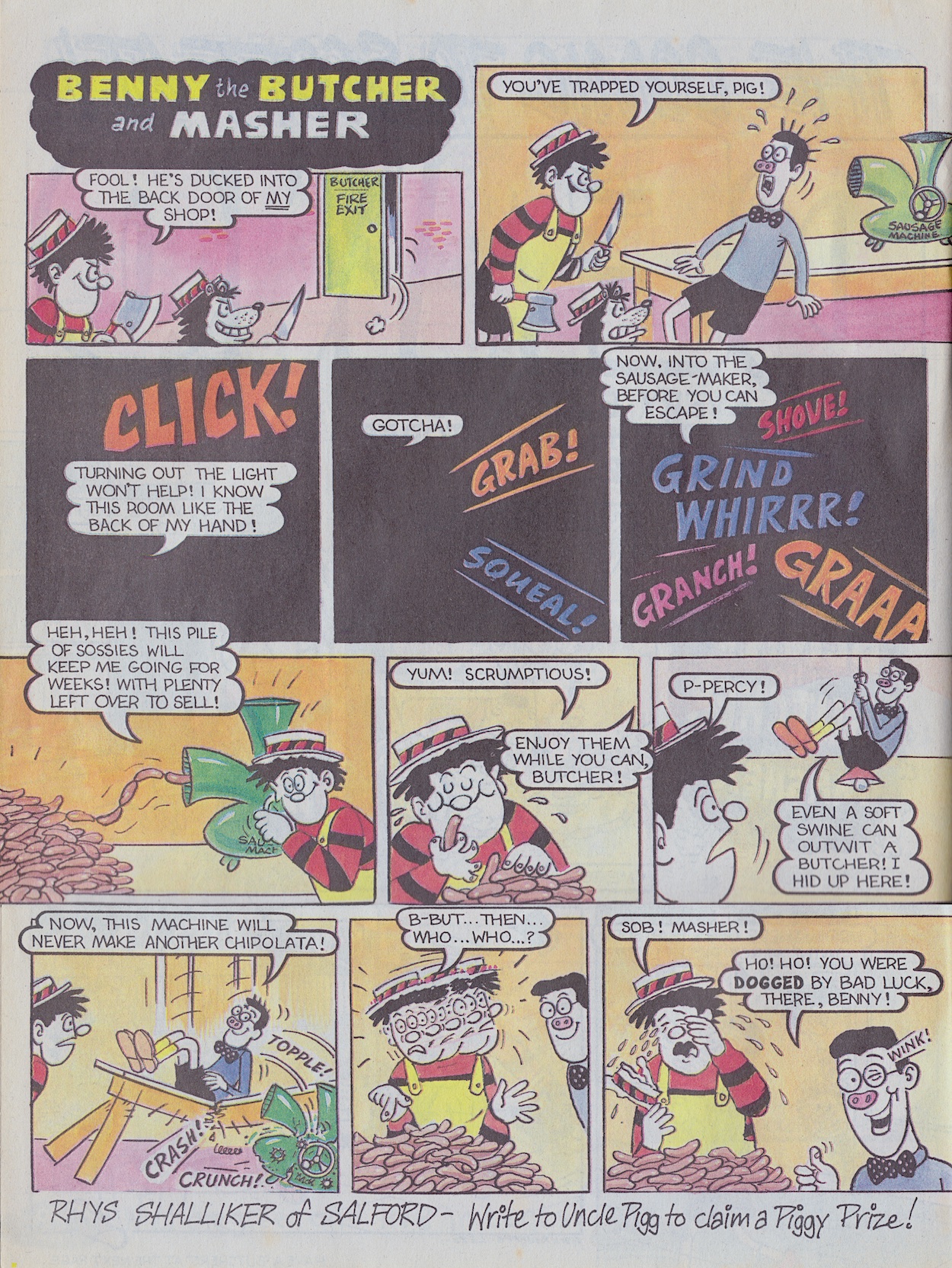 I’m sure Michael Spencer of Poynton was thrilled to see his work in the comic, introduced by Uncle Pigg and the plops on the previous page. You can’t fault the imagination on show and it reminds me of the comics my friend Roger and I made for each other in school, which were usually riffs on Marvel UK comics such as Transformers and The Real Ghostbusters. From memory, Roger created The Battleoids and School Busters, while mine were called War-Bots and The Real Smokebusters. (Hmm, definitely not as original as Michael’s strip.)