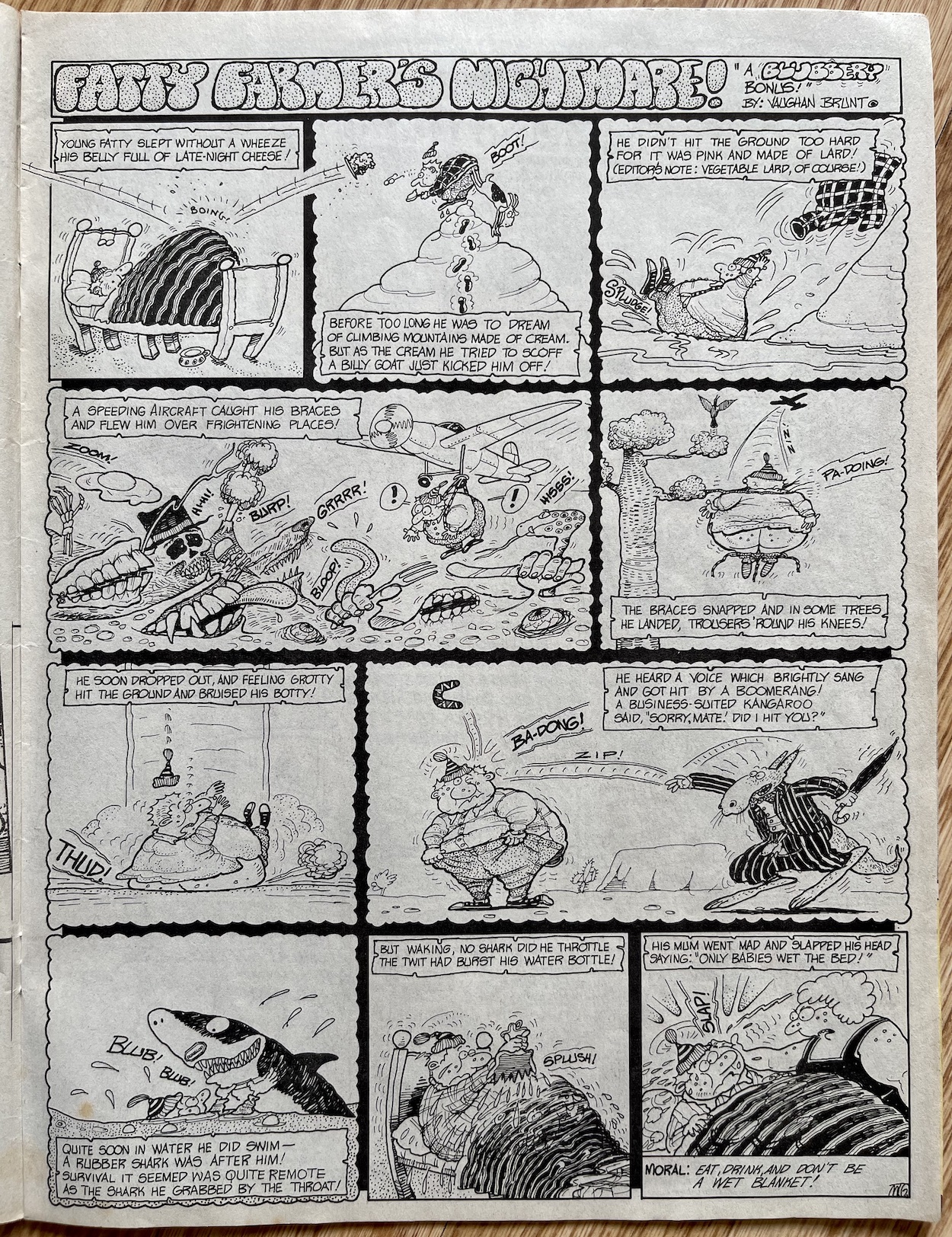 Also introduced in #15 and advertised as a regular was Fatty Farmer, normally written by Mark Rodgers and drawn by Mike Green. Farmer appeared in five issues, then this is only his third appearance since and he’d only have three more to go. He was a loveable character who was often the subject of body shaming, although he’d never let it get to him and his cheery demeanour would see him get one over on the bullies every time.