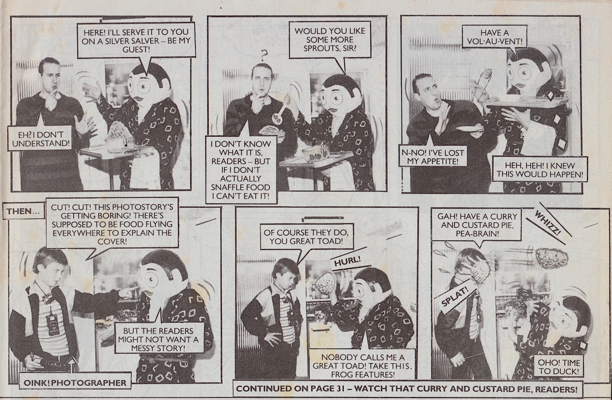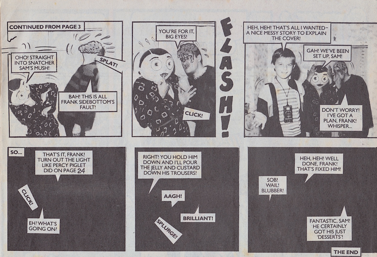 Time to round off this issue’s review with the conclusion of our photo story starring Marc Riley as Snatcher Sam and Chris Sievey as Frank Sidebottom. The custard pie has made its way through the comic to end up splattered all over Sam so the OiNK photographer finally gets their shot. In response the reluctant cover stars plot revenge and this is where the reference from earlier comes back to funny effect.