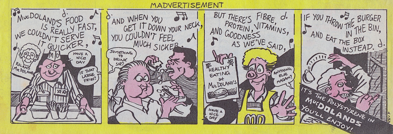 This issue saw the very first contribution from none other than Kev F Sutherland. A prolific cartoonist in OiNK’s weekly and monthly issues (his work would make up nearly a sixth of the final issue!) this was the only time his art would be seen in the fortnightlies. It’s great to see him join the fray at last. A small, quarter-page three-panel Madvertisement riffing off the McDonald’s TV adverts of the day, not only is this Kev’s first OiNK strip, it’s his very first published work.