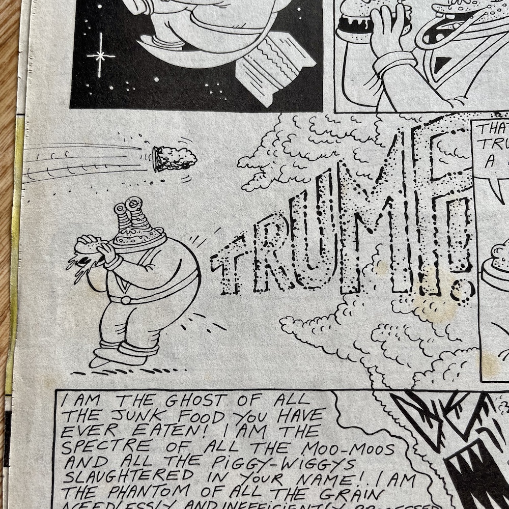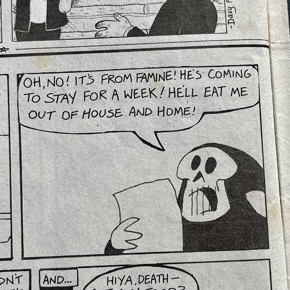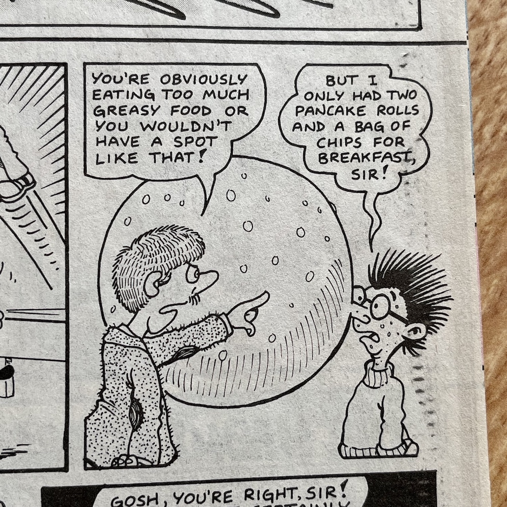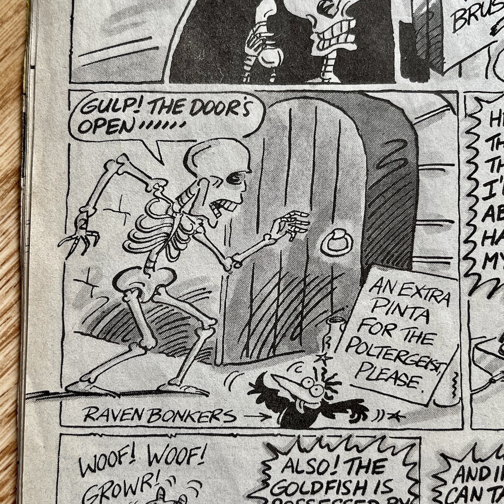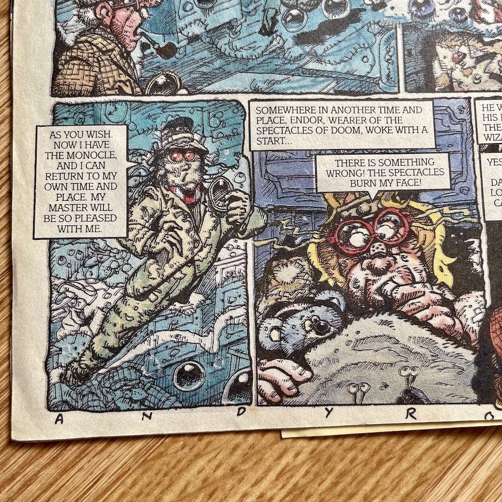 Other highlights of this issue include Burp doing political satire three decades early, Death’s hilarious reaction to an unwelcome visitor, our dense-but-buffed Endor and his magical spectacles being woken from their apparently cuddly sleep when the Monocle of Mayhem is stolen by a ghost and Pete giving us a hint as to why he may have that pimple in the first place.
