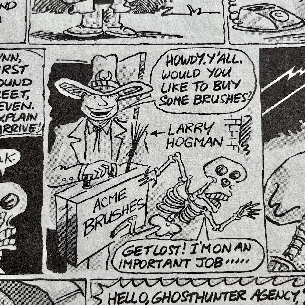 A quick note on those last two panels. This was the first appearance for new serial Jimmy Flynn, a boy who was “bathed in a weird light from a flying saucer” and ever since could make his skeleton jump out of his skin to go and investigate spooky goings-on. Each strip would hype a ‘Special Guest Star’ in the title too, only for that special guest to appear inconsequentially in one panel, as Larry Hogman (Larry Hagman, Dallas) does here.