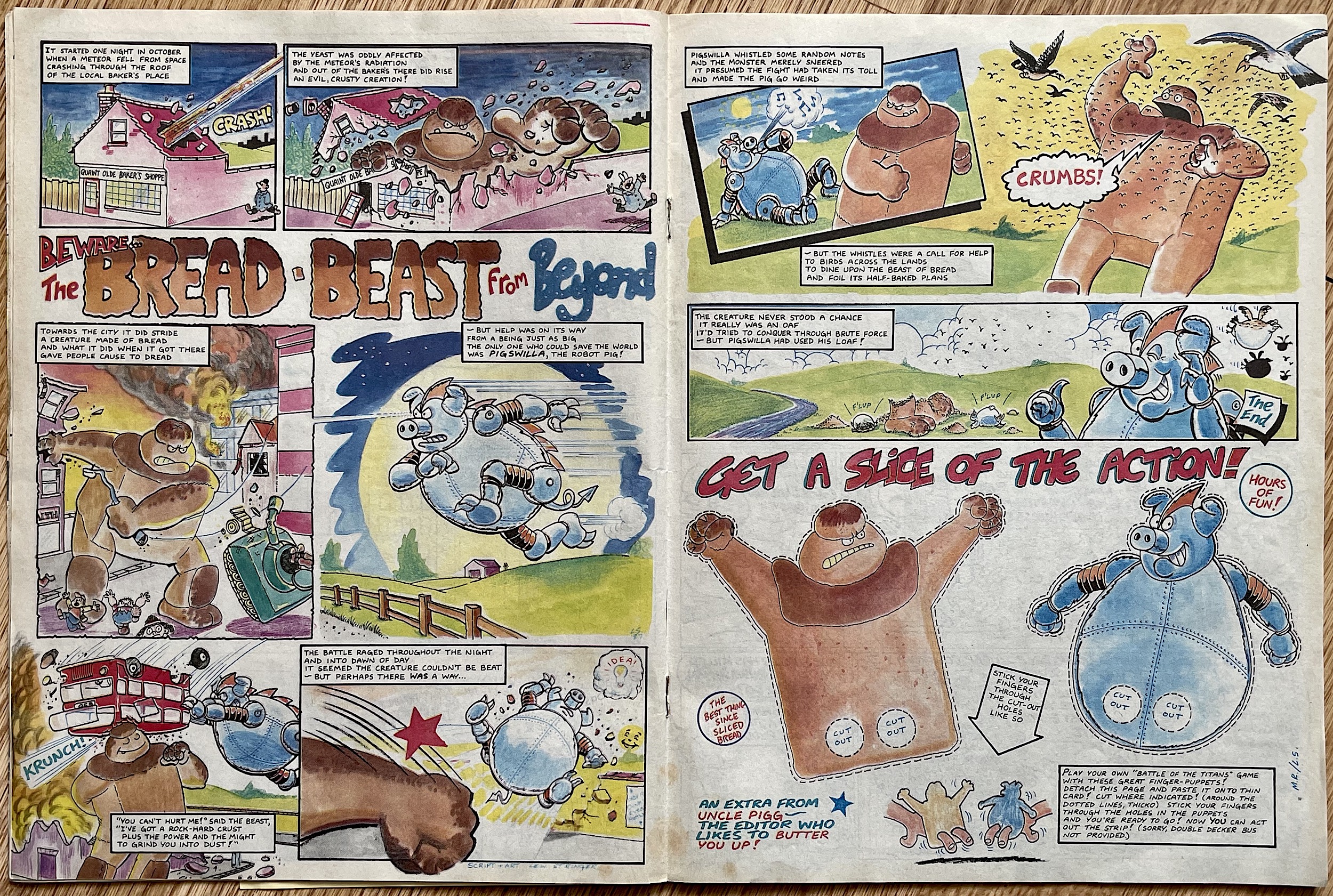 It’s all very funny, that exclamation by the Bread-Beast at the top of the second page along with his facial expression made me genuinely roar! You know you’re in for a treat when you turn a page and find Pigswilla is in the issue and we were never let down. The strip ends with cut-out finger puppets and by the initials it appears Mark Rodgers had a hand (boom! boom!) in those. Lew would do something similar to brilliant effect with his Combat Colin strip in Marvel UK’s Transformers a few years later.