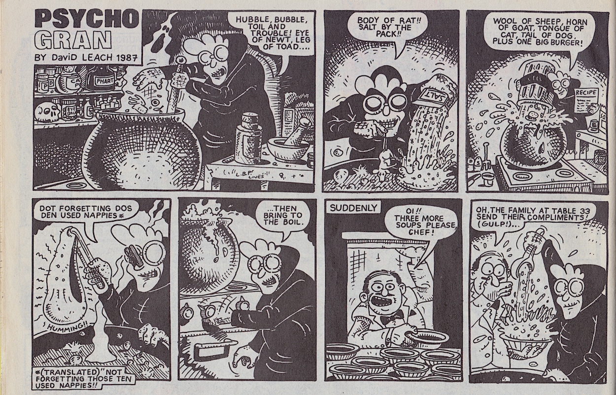 We’ll get back to that at the end of the review, as intended. As I mentioned in the OiNK’s Golden Age post this was my very favourite time in OiNK’s run, mainly because all of my very favourite characters, writers and cartoonists were present in almost every issue. One character who I’d always thought was always present from the moment she first appeared was Psycho Gran by the insanely talented (and all round decent feller) David Leach.