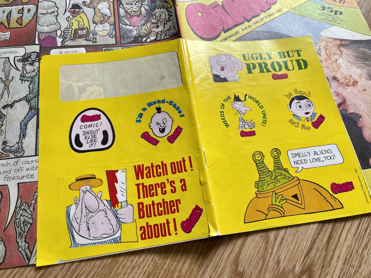 Our third and final set includes the same ‘Stick with OiNK’ on the back as previous issues and an array of stars with Burp, Horace (Ugly Face) Watkins, Harry the Head and Frank himself on the good quality, bright yellow stickers. The butcher one in particular I remember, I think it ended up on our fridge back in 1987 but not for very long. We wouldn’t get any more free gifts until the final issue, a gift that would lead me directly to my next comic obsession.