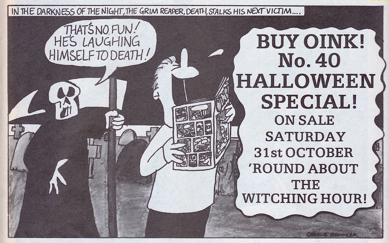Coming up on Monday is the highly memorable 40th issue of OiNK, the second Hallowe’en edition. Featuring a simply gorgeous Ralph Shephard cover that any original pig pal will remember, I’ve my own very personal memories attached to this issue so expect a particularly nostalgic review in three days. The Next Issue promo from the previous issue set the tone perfectly for what was to come.