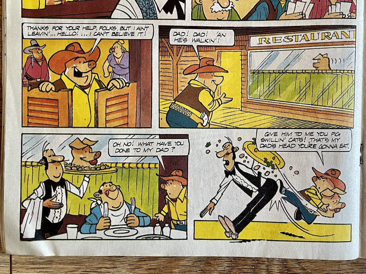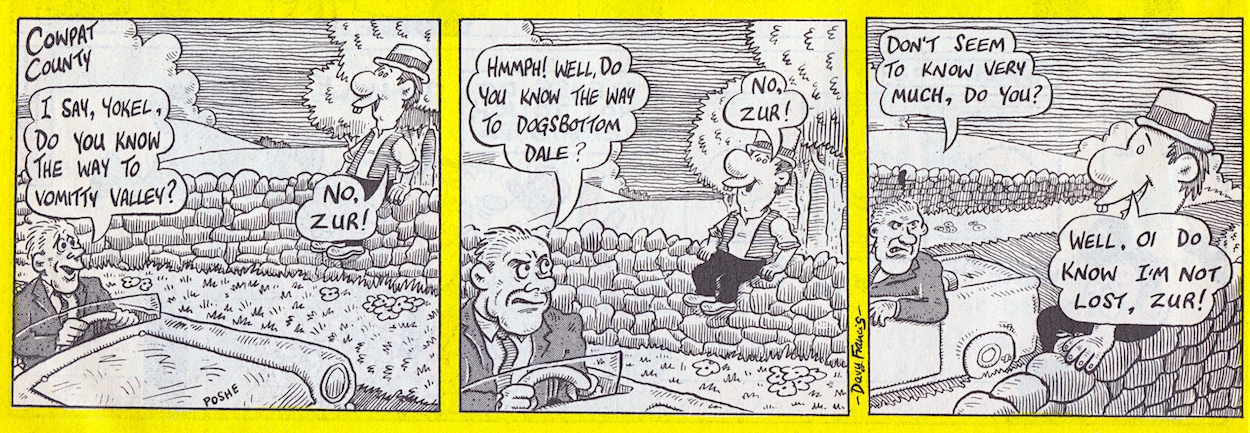 Elsewhere there’s a fantastic photo collage of Frank’s time recording a sketch for Saturday morning children’s TV show No.73. I loved that show and the page in question will be part of a special post later in the year. That’s all I’m going to say for now, other than it’ll be worth the wait. Back to the issue at hand and underneath a three-quarter-page Pete and his Pimple (backing up what I said for the last two issues about the return of a more varied layout to the comic) is the latest Cowpat County from Davy Francis.