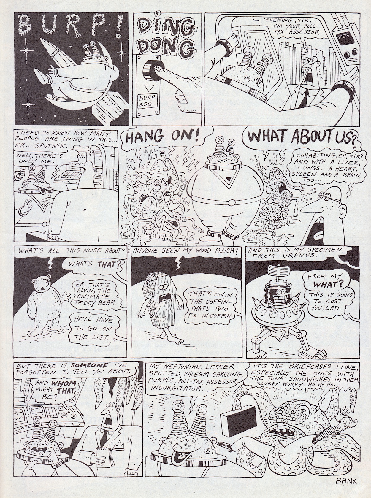 The highlight of this issue for me is Jeremy Banx’s Burp. That shouldn’t be a surprise, I’ve never made a secret of the fact I’m a huge fan of Jeremy’s work, especially his strips for this particular smelly alien from outer space. But if you cast your mind back to the previous review, when I was delighted to see the return of Alvin and found the now-sentient coffin so funny, you’ll understand why this week’s strip was a particular thrill to read.