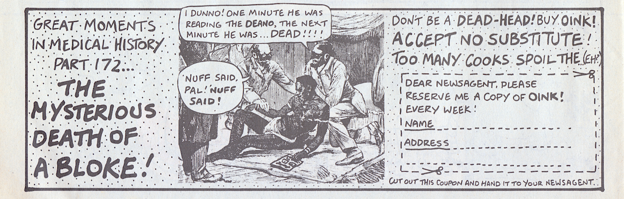 Patrick Gallagher‘s reservation coupon rounds things off as usual and it’s been another fantastic read this week. I’m even getting used to the 24-page format. There’s more crammed in now so it’s taken longer to read than the first handful of weeklies. Great stuff. The next OiNK has one of the best covers of the whole run. If you thought what Lew Stringer did with the logo last week was something special just wait ’til you see what he does with it in just six days on Friday 3rd March 2023. (1988 was a leap year, so we’re missing a day.)