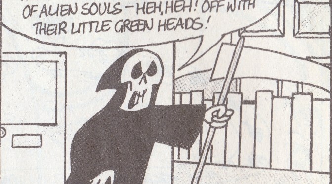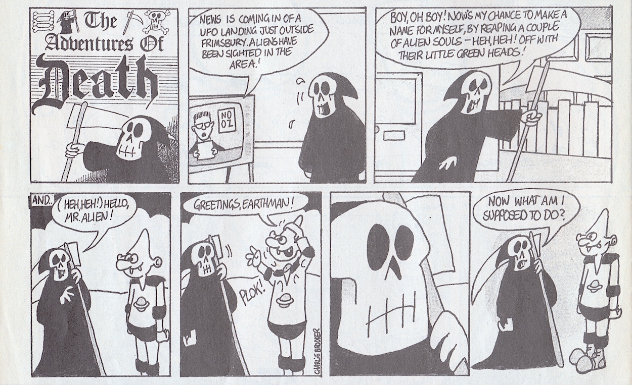 We’ll stick with Charlie for one more strip I think and the return of The Adventures of Death, one of those favourite not-as-regular-as-you-remember regular characters. Death was in every edition for six issues to begin with but as Charlie’s repertoire expanded the Grim Reaper became one of several of his creations he had to split his time between. Remember folks, he was still at school! It appears he’s now becoming one of OiNK’s main contributors though. Personally, Death is still a favourite character after all theses years.