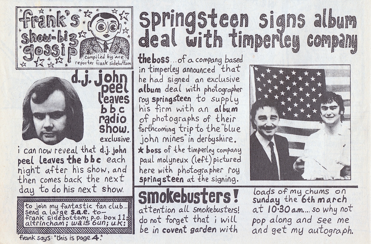 My favourite part of this is the difference between the Springsteen headline and what the story actually is; it’s very clever and very funny, reminding me of those headlines you’ll see from certain websites where every word has a capital letter. You know the type. Nice to see the Smokebusters still going strong after first popping up in #46 (and of course the special edition) and the huge headline on the cover is reduced to a tiny side panel with another hilarious non-story behind it all, aping the tabloid press of the day. (Of the present too.)
