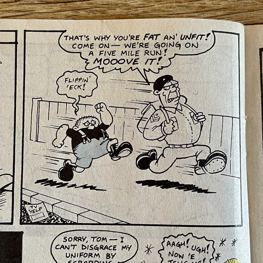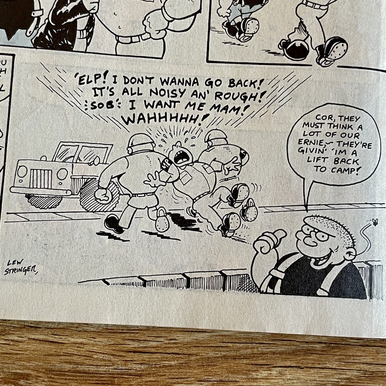Elsewhere there’s a wonderfully dark yet silly moment as Billy the Pig continues his search for his rustled family, and in Tom Thug there’s a surprise return for big brother Ernie who first popped up seven days ago. This time he’s off for good though, when we find out he’s been charged with being AWOL and in his final panel the character’s bravado we’ve come to know for these two issues disappears completely. Speaking with Lew, he’d forgotten all about Ernie. He was never mentioned again, even in all the years Tom was a regular in Buster.
