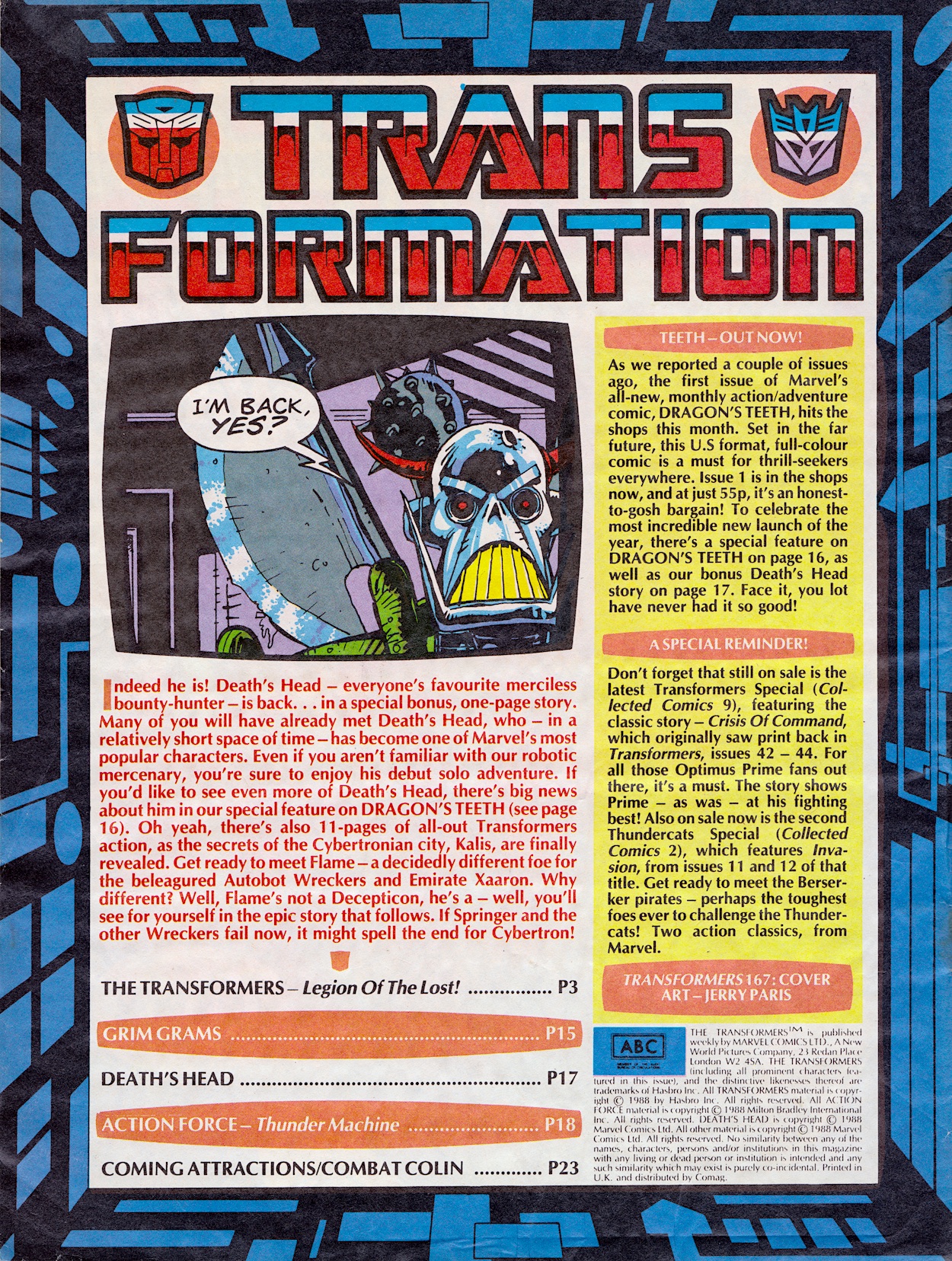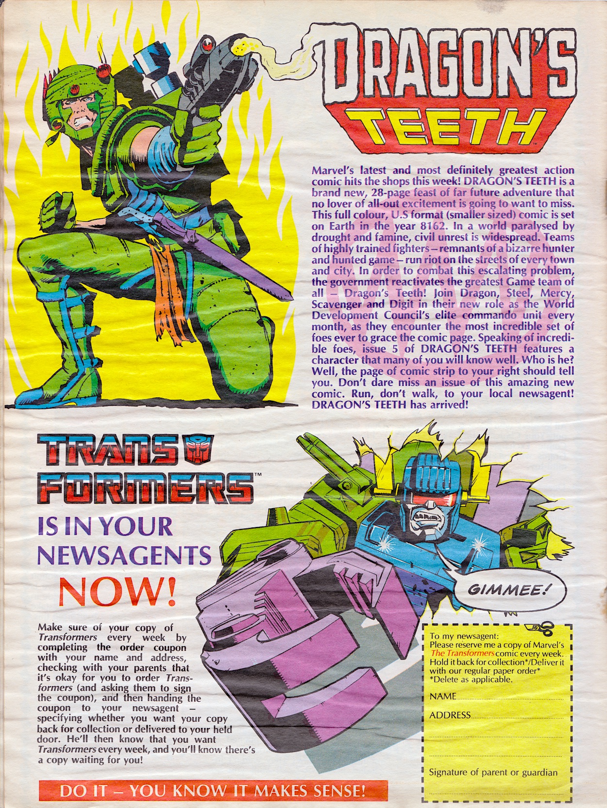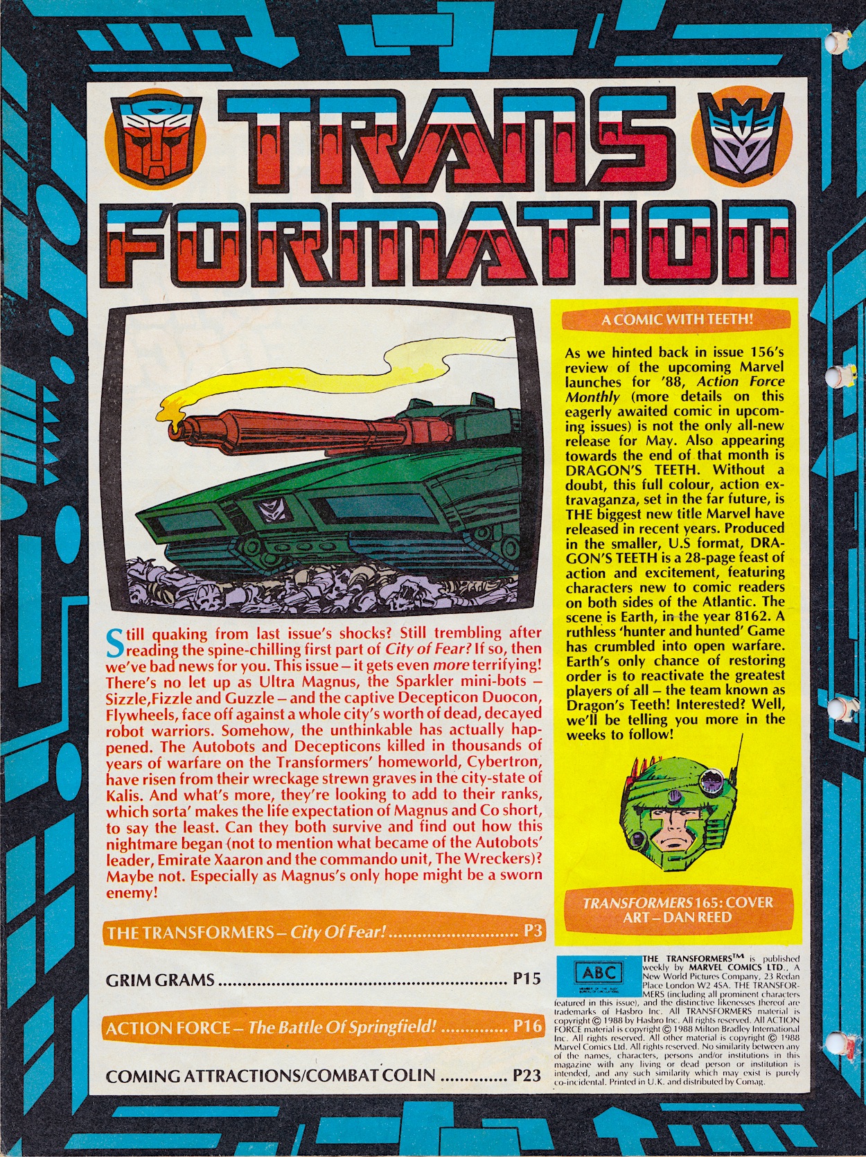 Dragon’s ‘Teeth’? We’ll get to that. So, all was set for the UK arm of Marvel to release its first original smaller format monthly. Regular readers of the blog will know I’ve already begun the Death’s Head read through with an introductory post and his guest appearance in Doctor Who Magazine. His own US-format comic would appear in November 1988, but up first came Simon Furman and Geoff Senior’s other original creation, although Transformers doesn’t mention they’re the pair behind it yet.