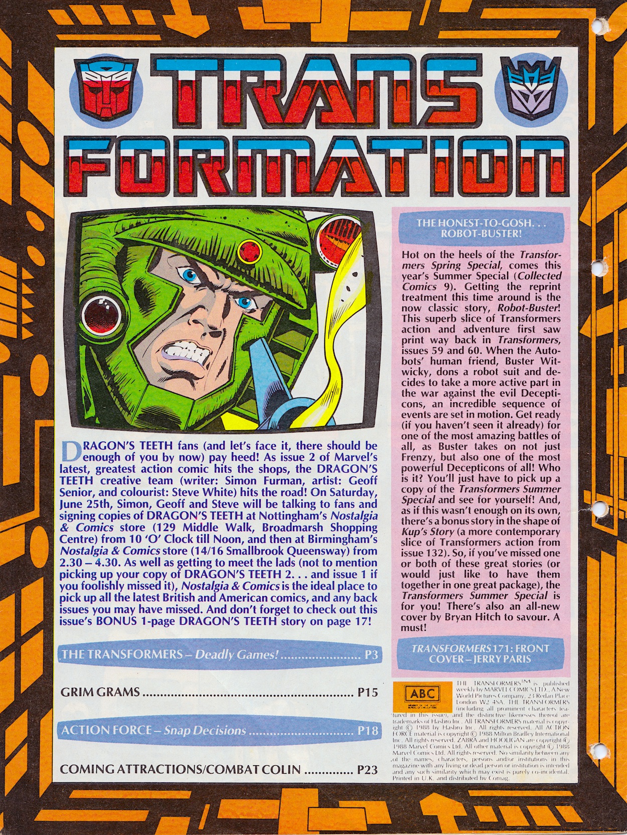 In fact, the first issue didn’t go on sale until 11th June (according to the Mighty Marvel Checklist in other Marvel UK comics of the time) and under the name Dragon’s Claws, yet a week later on 18th June Transformers #171 ran another editorial calling it by the original ‘Teeth’ and hyping #2. Of course, deadlines being what they are this would’ve been written before the name change and the subsequent delay. At least they were finally promoting who was behind it to Simon’s and Geoff’s fans.