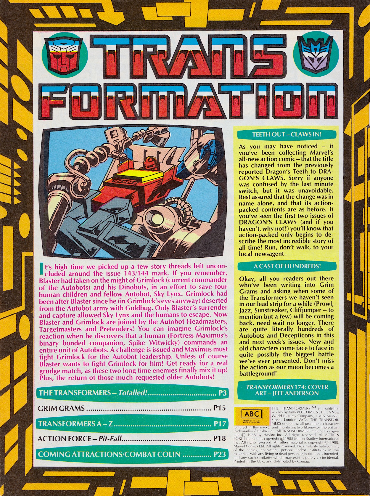 Eventually in #174 of Transformers, not on sale until 9th July(!), the date the second issue was actually released the name change was finally mentioned. That was a bit of a rocky launch, wasn’t it? So what happened? At the last moment it had come to Marvel UK’s attention a small press comics company had the same name and so ‘Teeth’ became ‘Claws’, although the logo (created by editor Richard Starkings) stayed the same. I’ll admit I never knew of the original name until decades later and yet the logo never seemed out of place. Now, it’s obvious why it’s a set of teeth, of course.