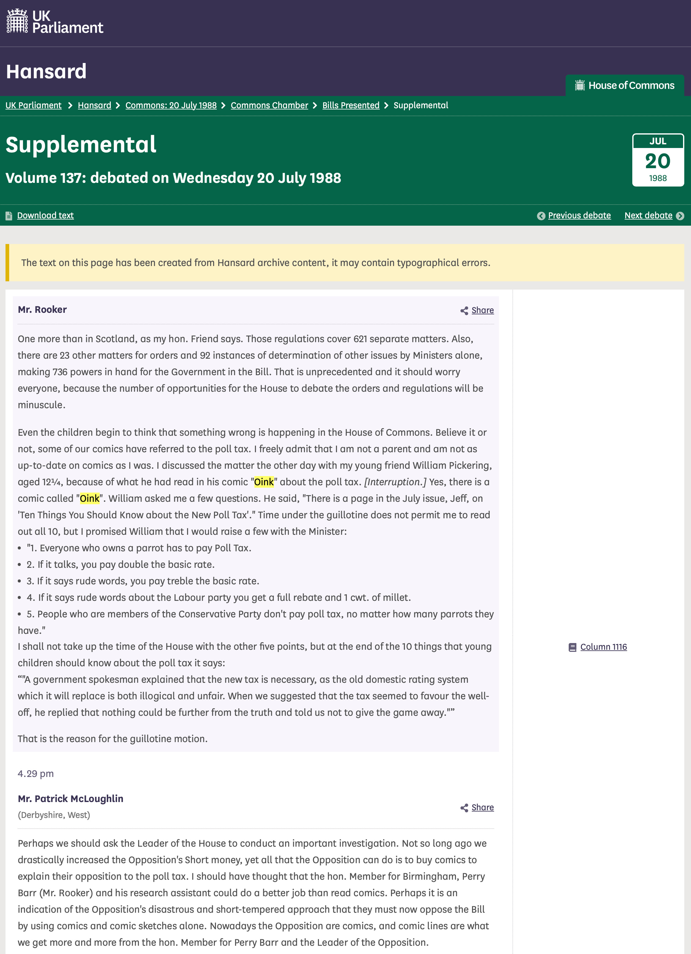 The parliamentary records are much more accessible today thanks to the Internet and a quick search for ‘OiNK’ in the year 1988 brings up the full session from that day. This includes the complete exchange between Rooker and fellow MP Patrick McLoughlin who, in typical Conservative fashion, completely ignores the point of why the comic was quoted in the first place.