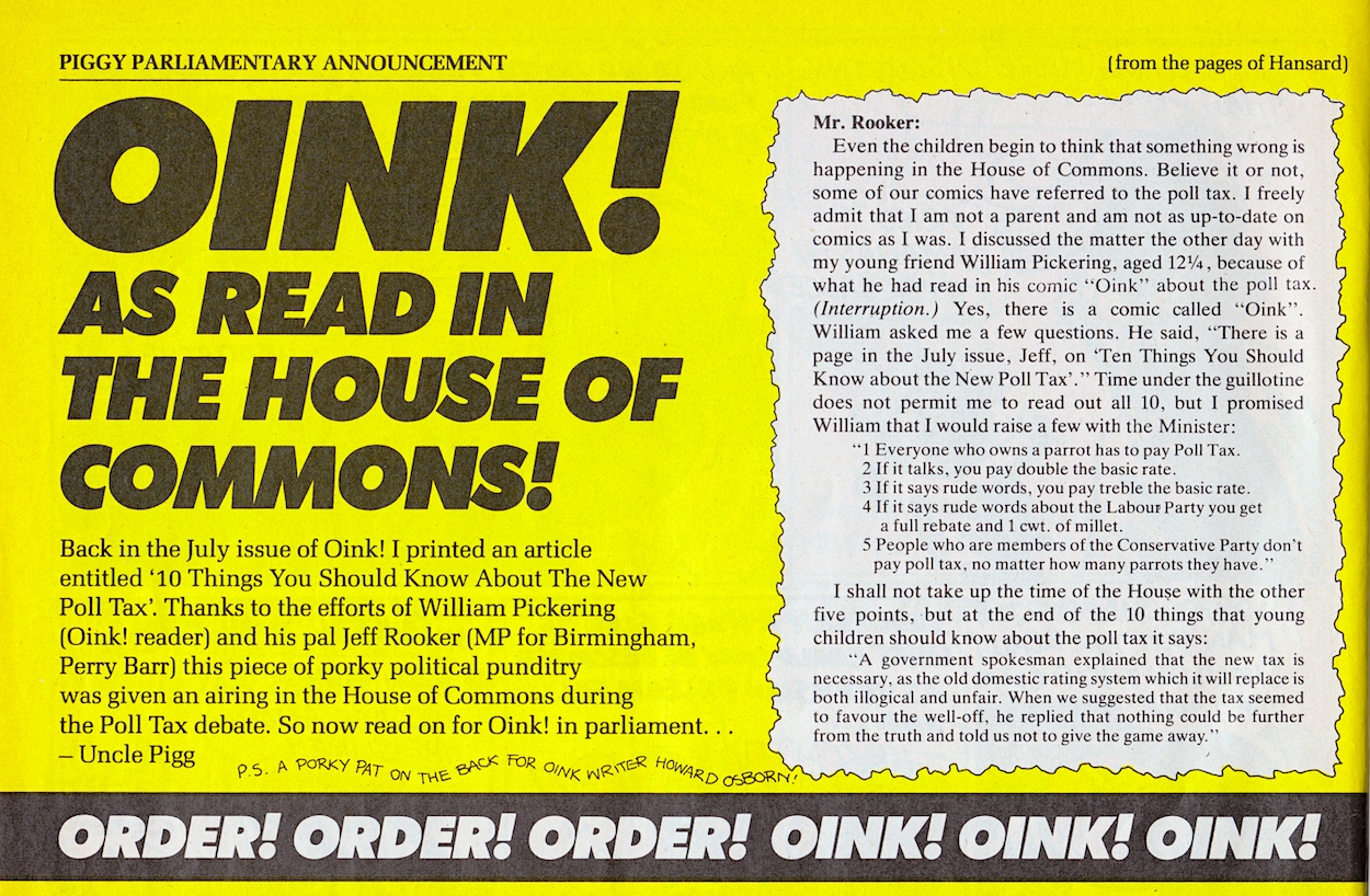 Fast-forward three months and #67 had the blurb, “As read in the House of Commons!” emblazoned on the cover. Inside, Uncle Pigg announced that a young pig pal by the name of William Pickering had reached out to local Labour MP Jeff Rooker, who the comic describes as William’s “pal” and showed him OiNK’s piece, for which Howard finally received the writing credit. Uncle Pigg thought readers might like to know his fine publication was then spoken about (and even quoted) in the corridors of power.