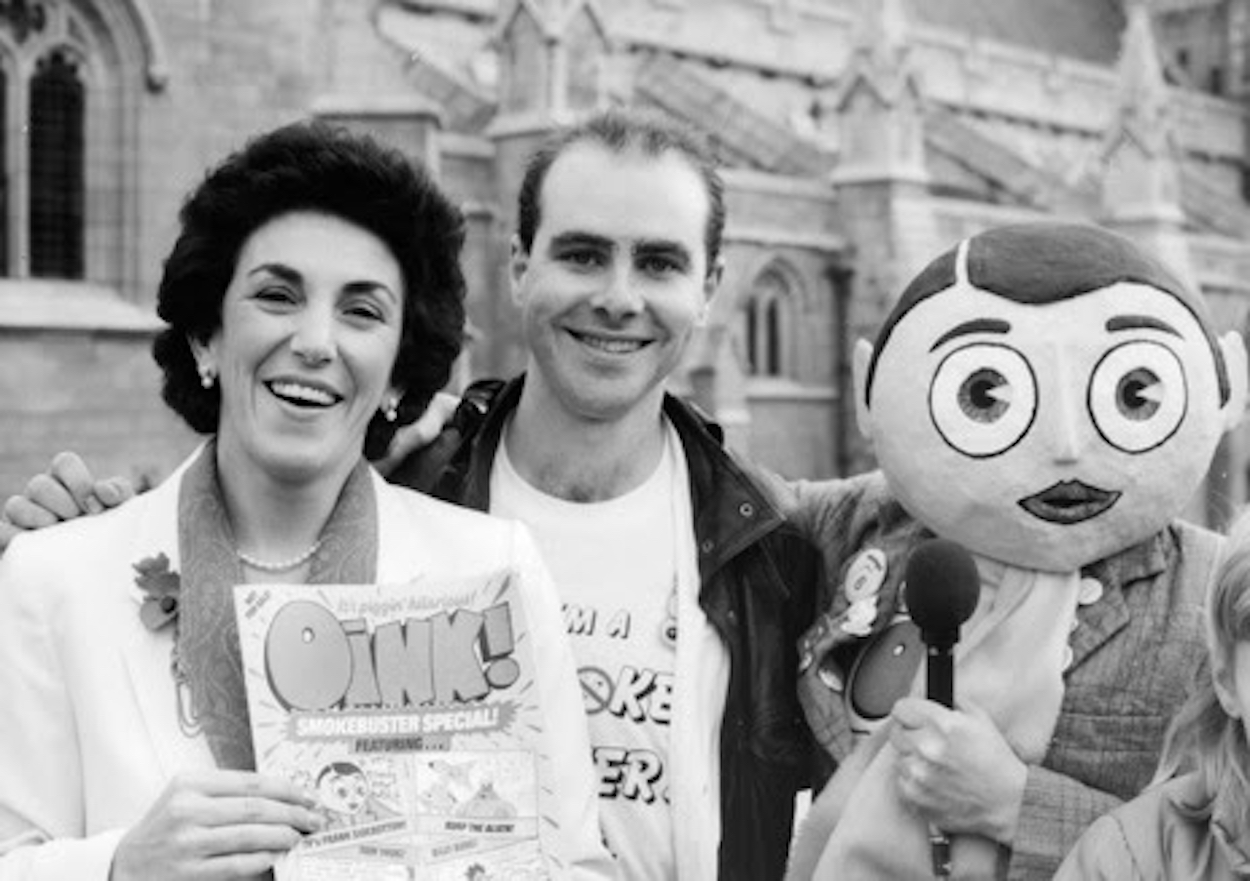 The text is from Hansard, the official record of the UK parliament. “From what I remember, Hansard made contact with us and informed us,” OiNK co-editor Patrick Gallagher told me. “It’s what we pay our taxes for, particularly Poll Tax in this case.” Just for the blog, Patrick reached out to Uncle Pigg on his tropical retirement island for comment, who snorted, “The impression I got was that they [Hansard] were a fan. Don’t forget, we also made an excellent impression on Edwina Curry so we were well respected and talked about in certain quarters of the government, too.” Indeed, here’s a photo from the Smokebuster Special promotion to prove his point.