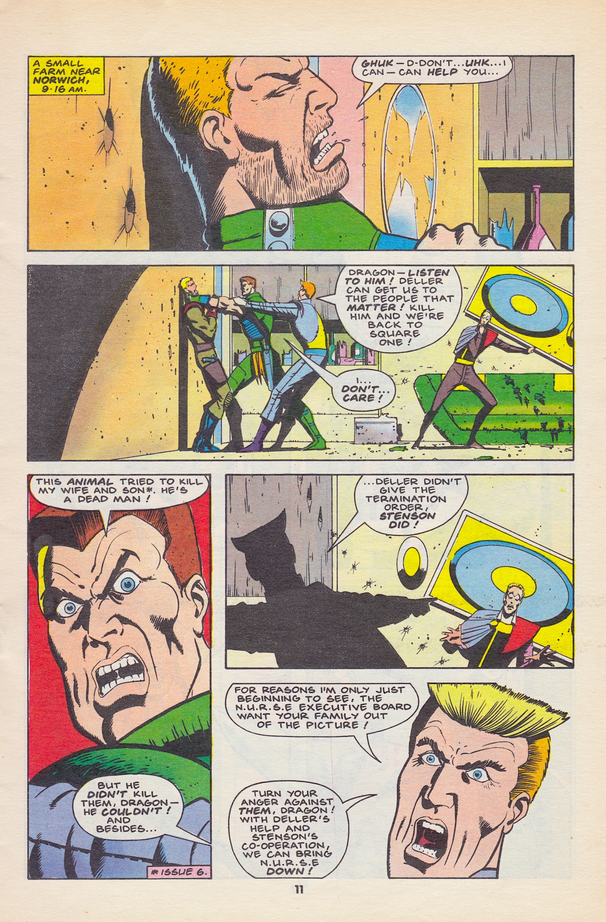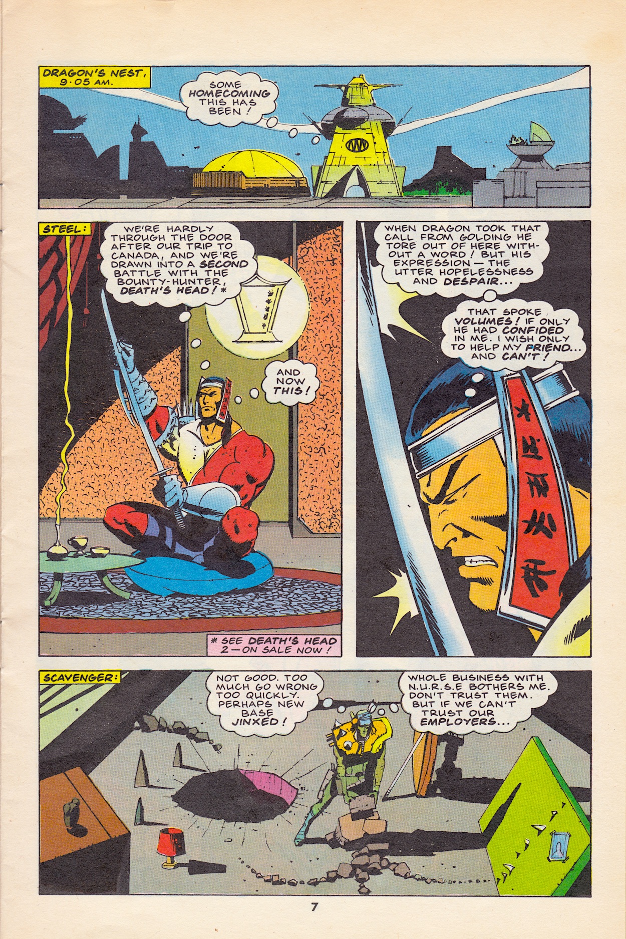 First we check in on the Dragon’s Claws HQ where Steel, Scavenger, Mercy and Digit are relaxing between missions (Scavenger fixing the hole created by a certain mechanoid in Death’s Head #2) and we find out Dragon himself has taken off after fielding a telephone call from the World Development Council’s Ambassador Golding, who we saw meeting Stenson and Deller last time in N.U.R.S.E. HQ.