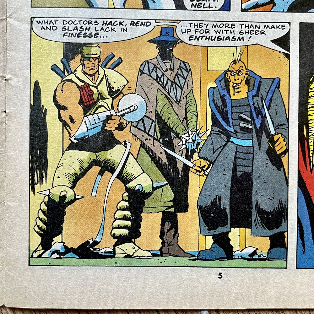 After losing three of his men in #2 to Dragon and his team, Slaughterhouse has recruited Hack, Rend and Slash who remind me somewhat of Hook, Link and Sinker, other creations of writer Simon Furman’s in Transformers. This isn’t the first (or indeed the second) time aspects of this comic seemed to contain a knowing nod towards that other title. Not much is made of these three, they’re really just here to make the numbers up, but Slaughterhouse and his true love, Death Nell play major roles this month and not just in administering a bit of chaos.